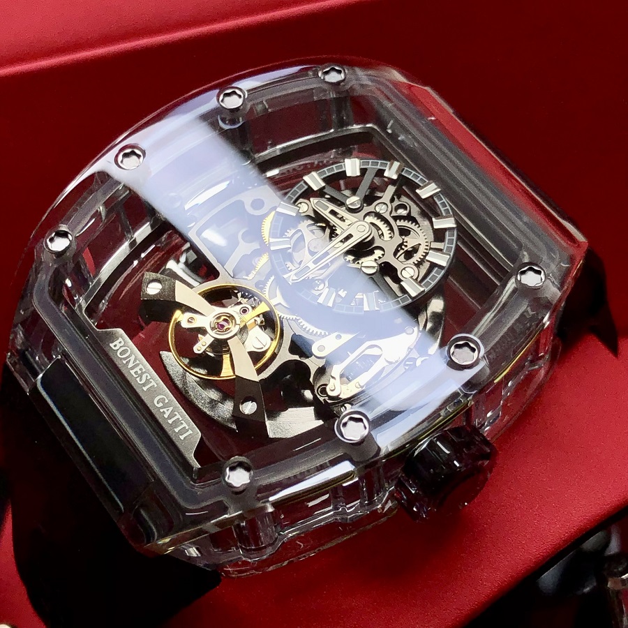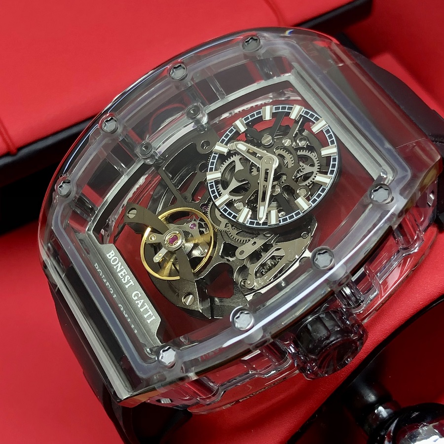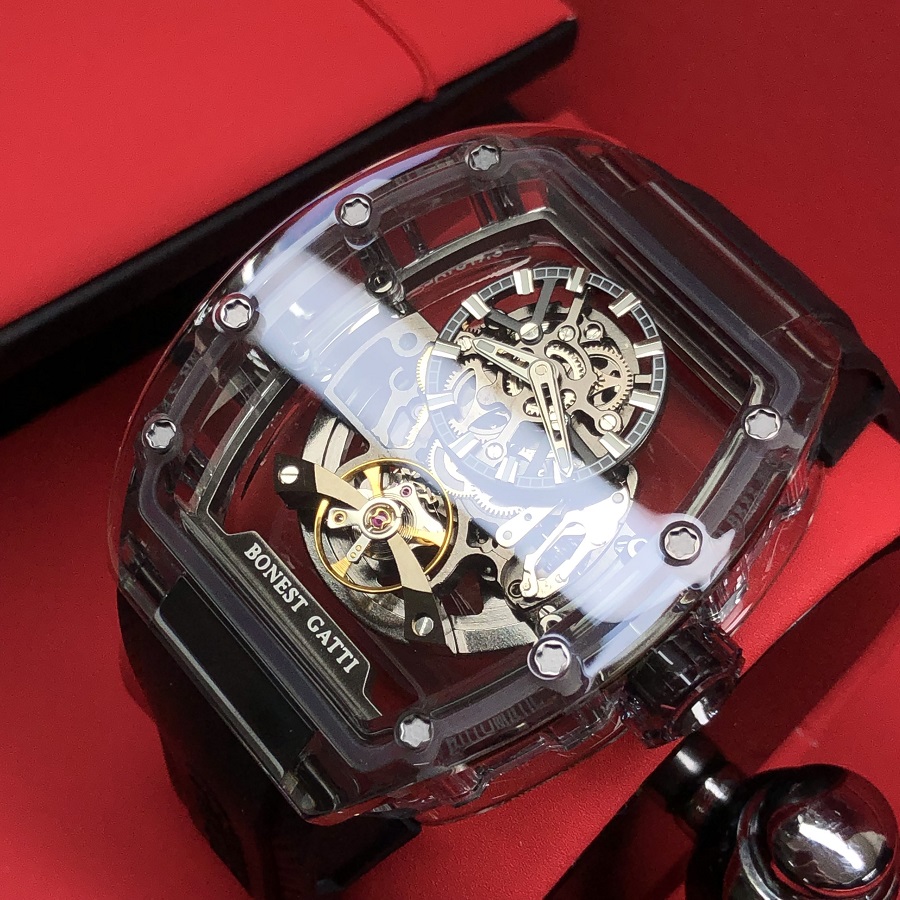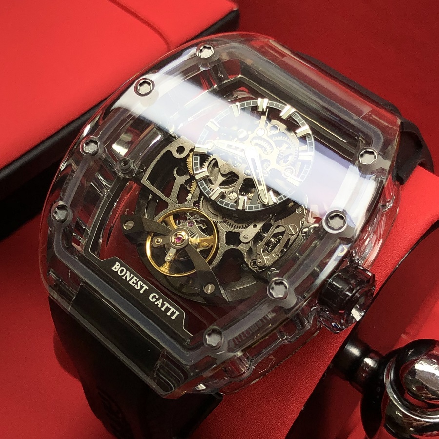 Điều đặc biệt là chiếc Bonest Gatti trong suốt BG9960-A1 được làm hoàn toàn bằng kính cường lực giúp chúng ta nhìn thấu bộ máy tuyệt đẹp của đồng hồ.