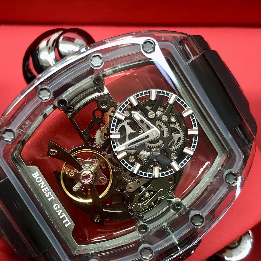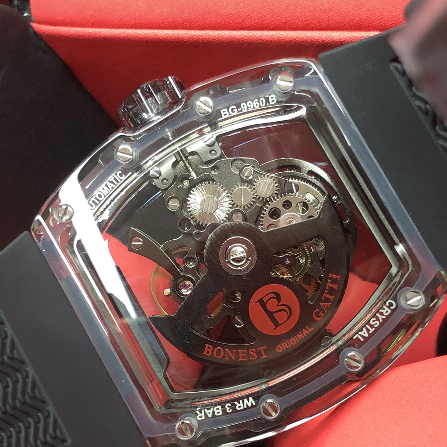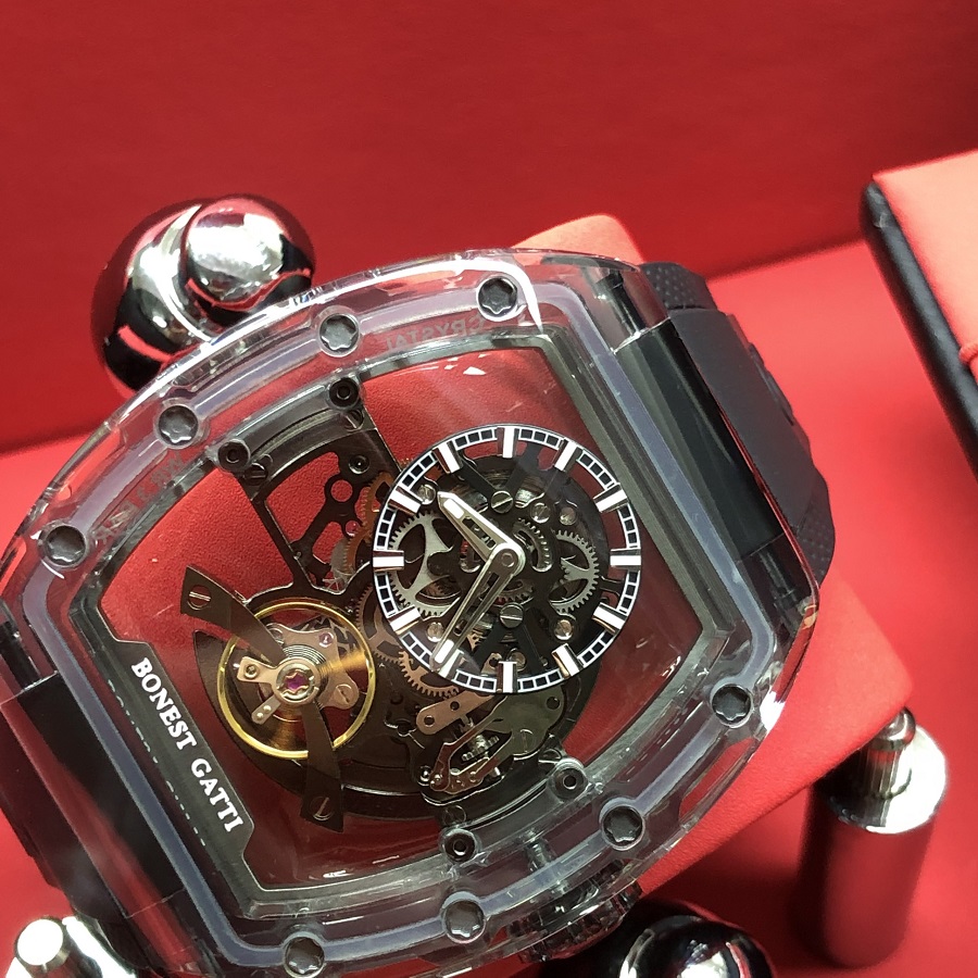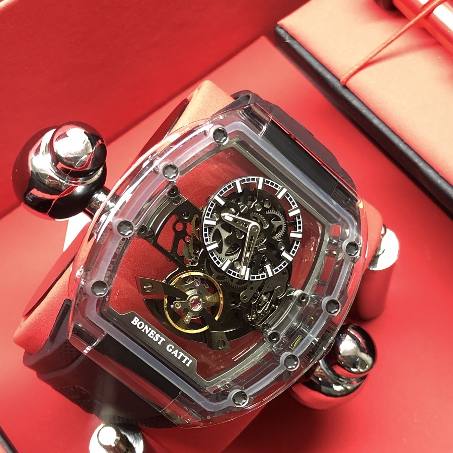 Điều đặc biệt là chiếc Bonest Gatti trong suốt BG9960-A1 được làm hoàn toàn bằng kính cường lực giúp chúng ta nhìn thấu bộ máy tuyệt đẹp của đồng hồ.