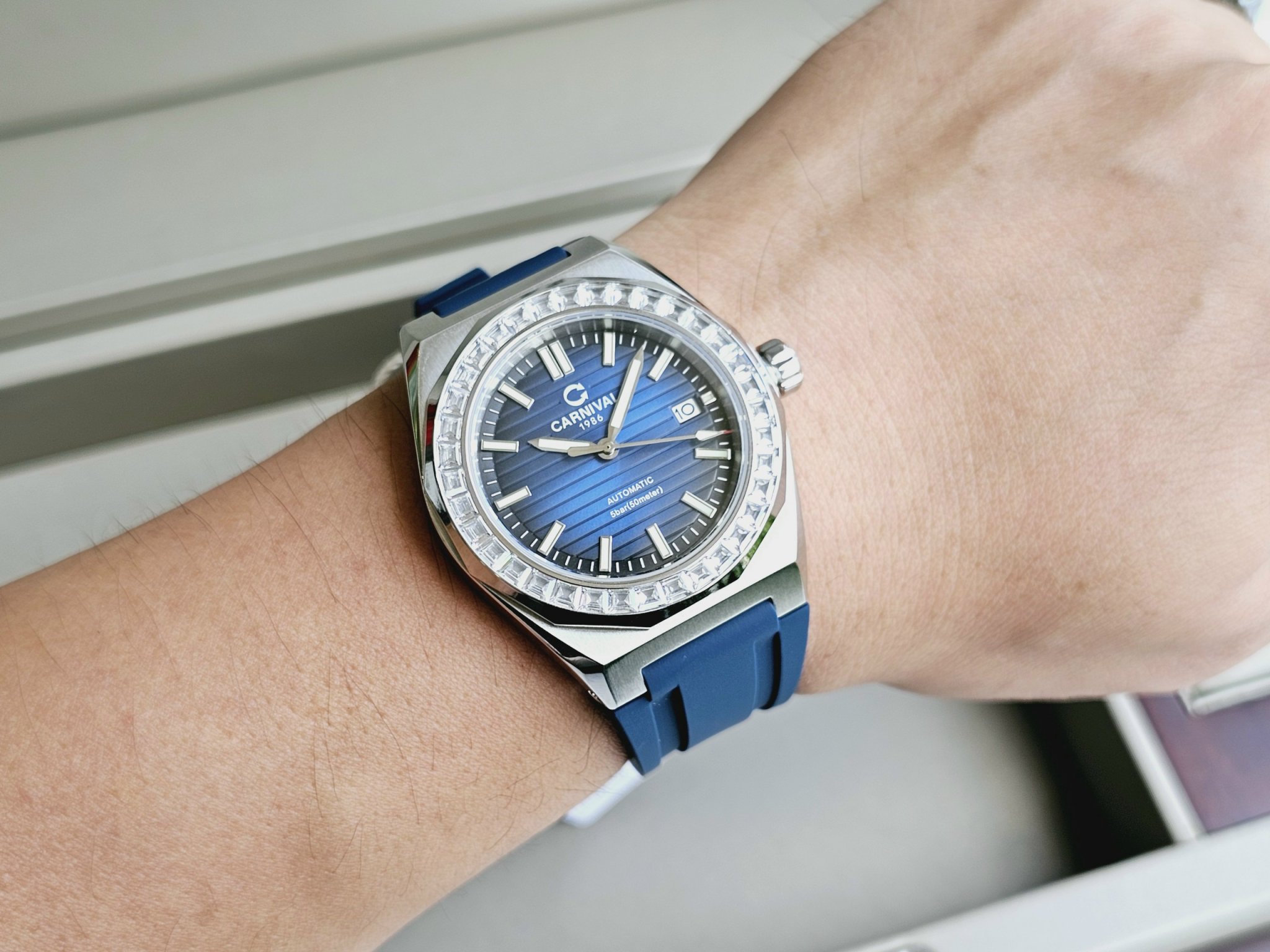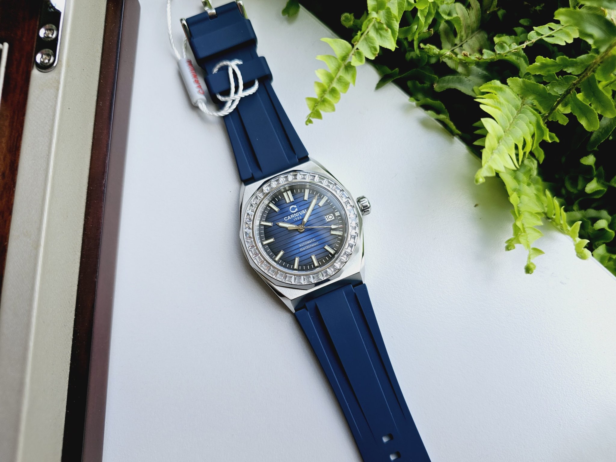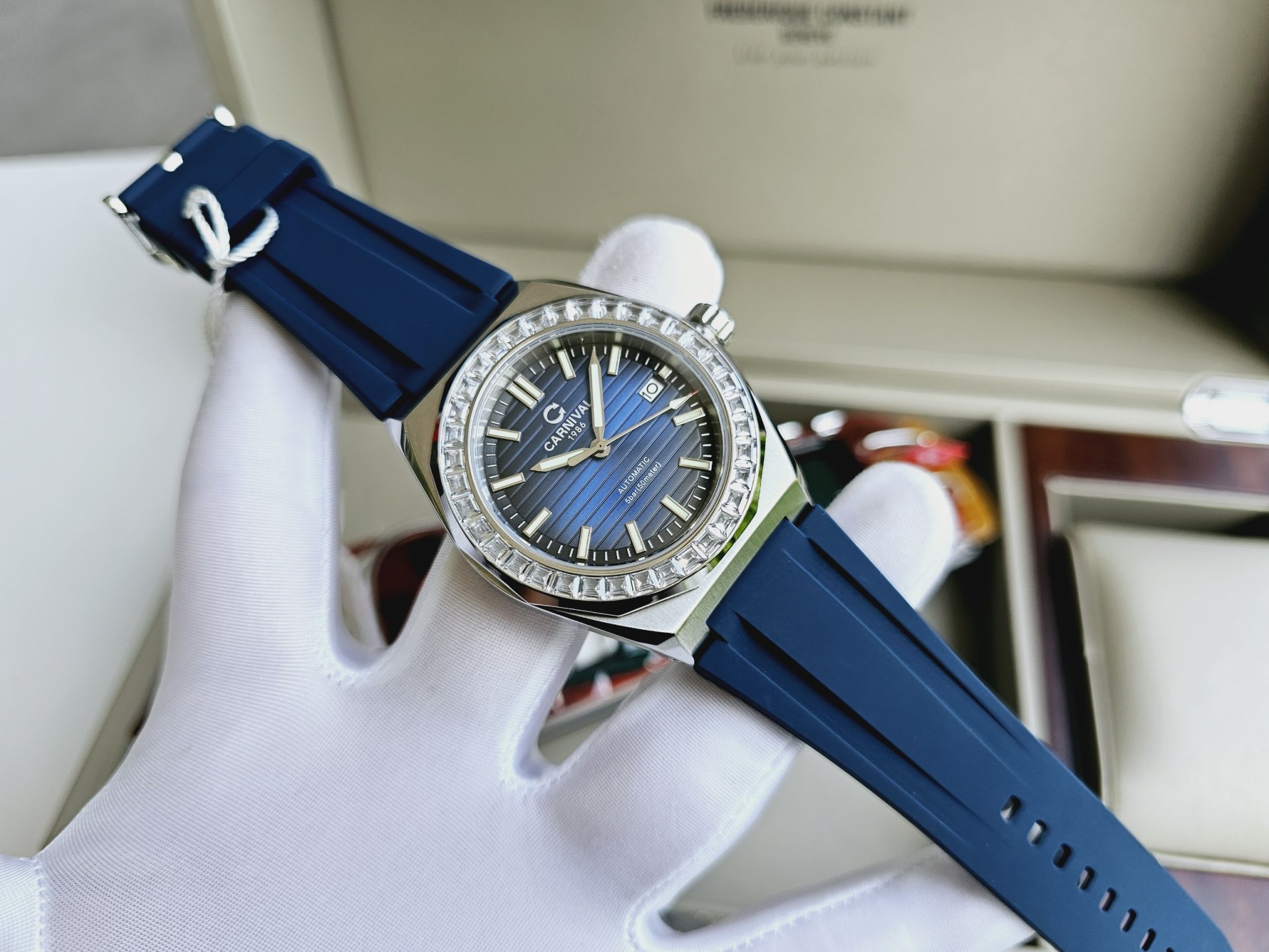 Một thiết kế mới đồng hồ Carnival 8107G-VT-DCS-X với mặt xanh dial vân sọc, cùng viền benzen đính đá siêu chất phong cách trẻ trung đẳng cấp phái mạnh