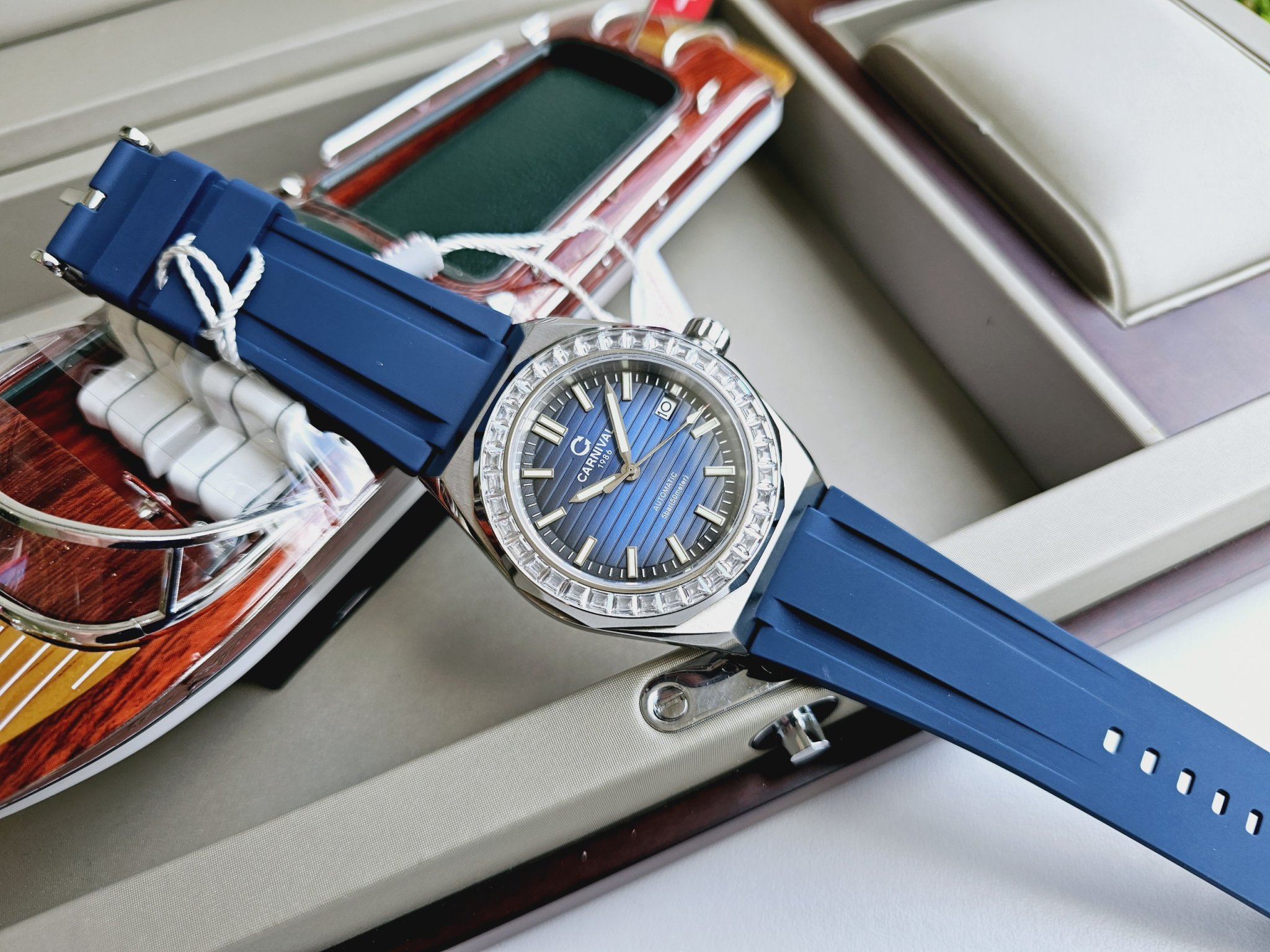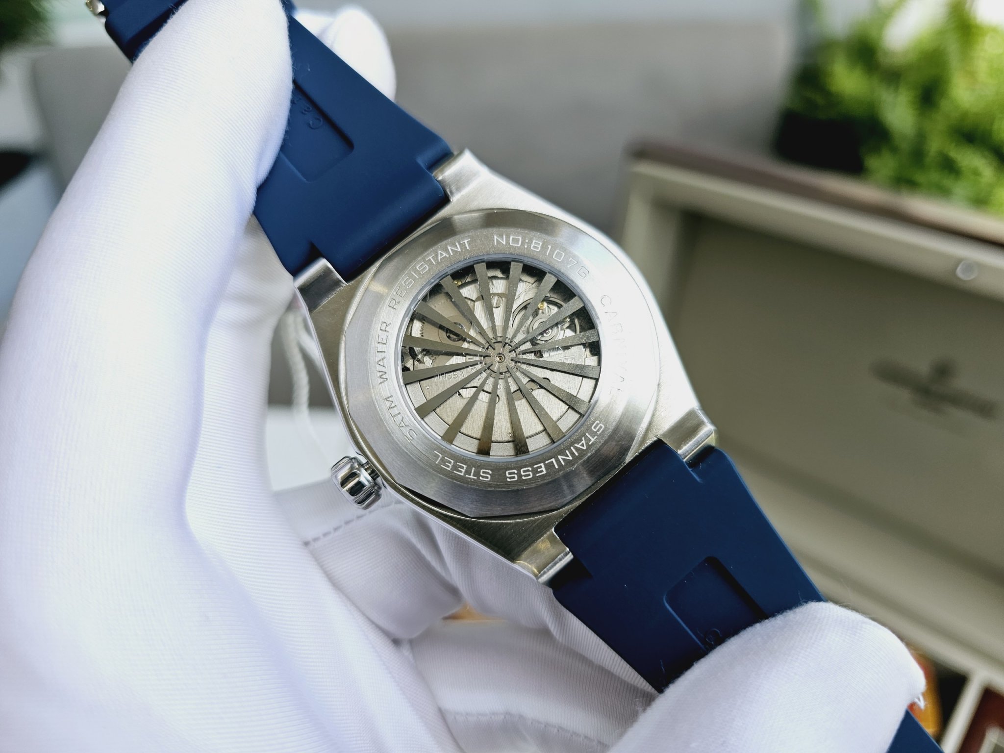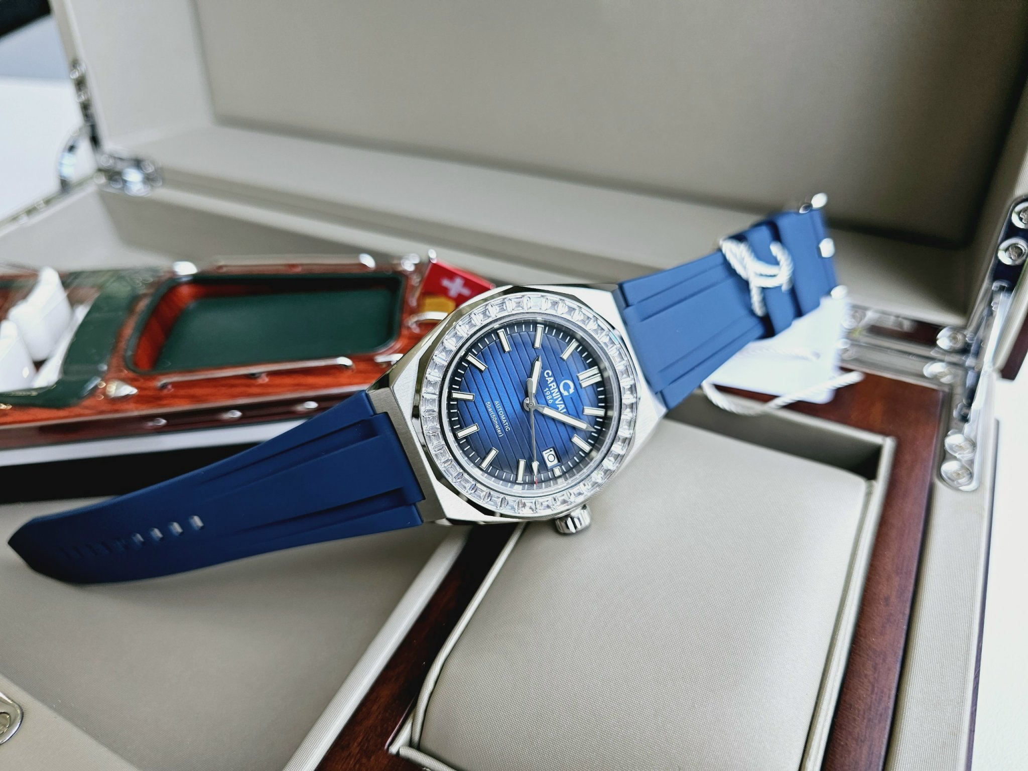 Một thiết kế mới đồng hồ Carnival 8107G-VT-DCS-X với mặt xanh dial vân sọc, cùng viền benzen đính đá siêu chất phong cách trẻ trung đẳng cấp phái mạnh