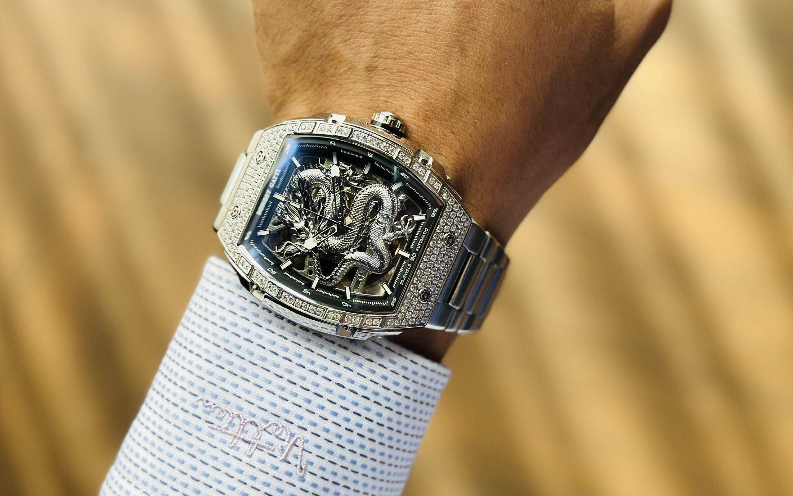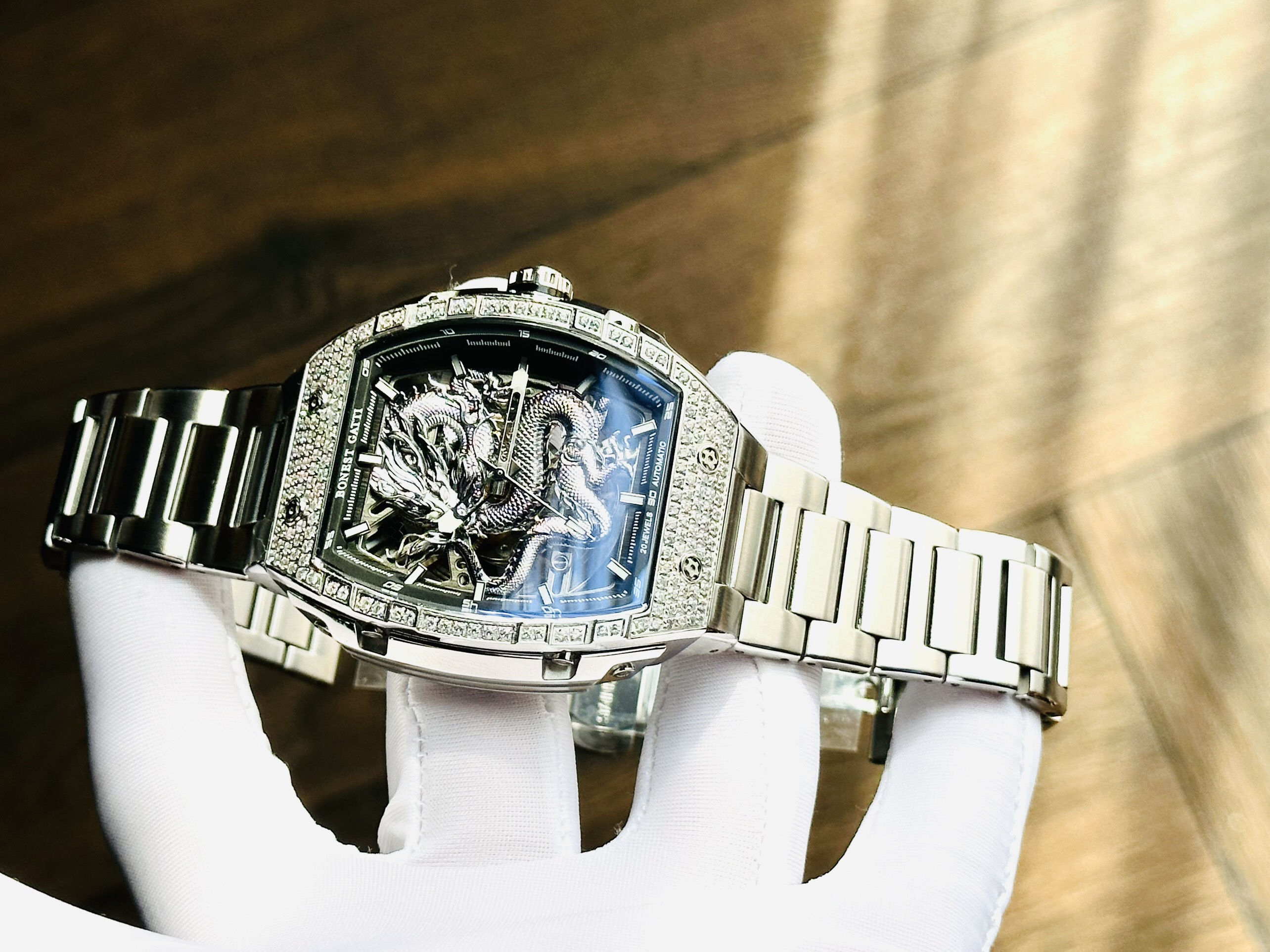 Siêu phẩm đang làm mưa làm gió trên thị trường Việt Nam trong suốt thời gian vừa qua. Đẳng cấp và cuốn hút với họa tiết rồng Châu Âu uốn lượn màu bạc. Bộ kim chỉ số dạ quang cùng mặt kính Sapphire hiện đại càng làm cho chiếc đồng hồ thêm nổi bật, đúng chuẩn tinh hoa trong ngành công nghiệp chế tác đồng hồ.