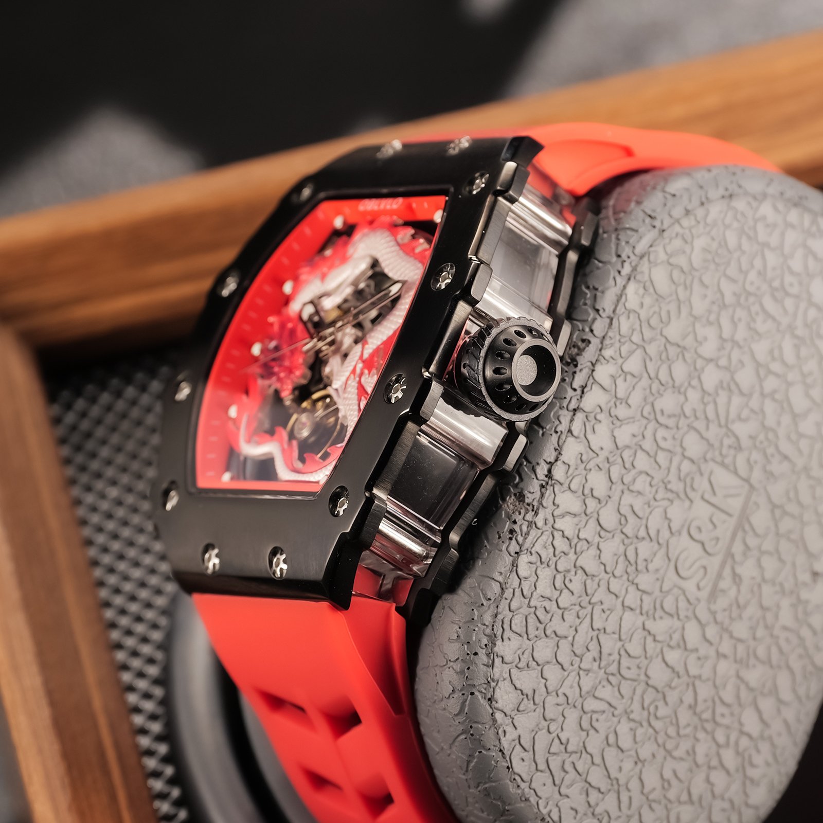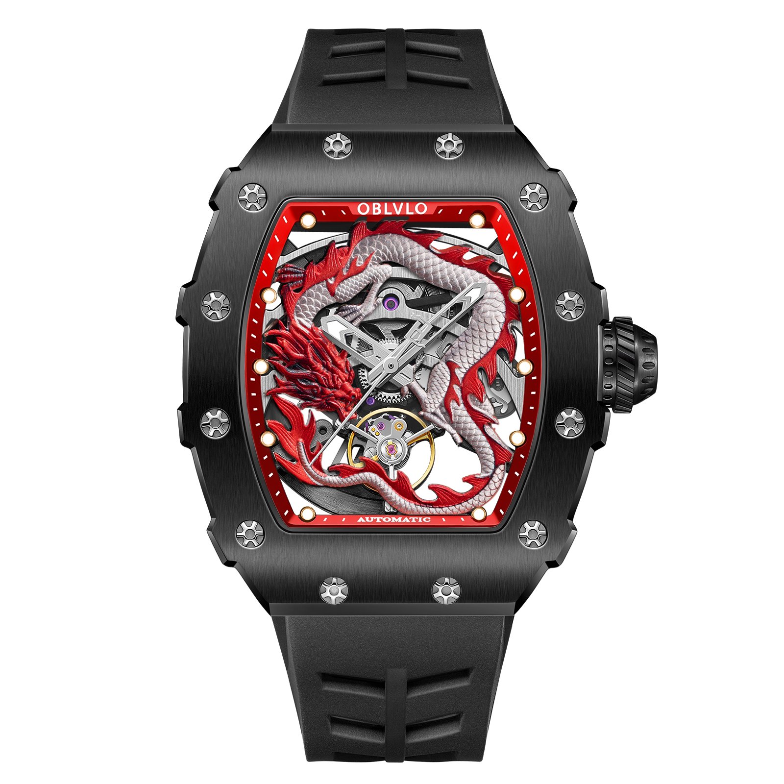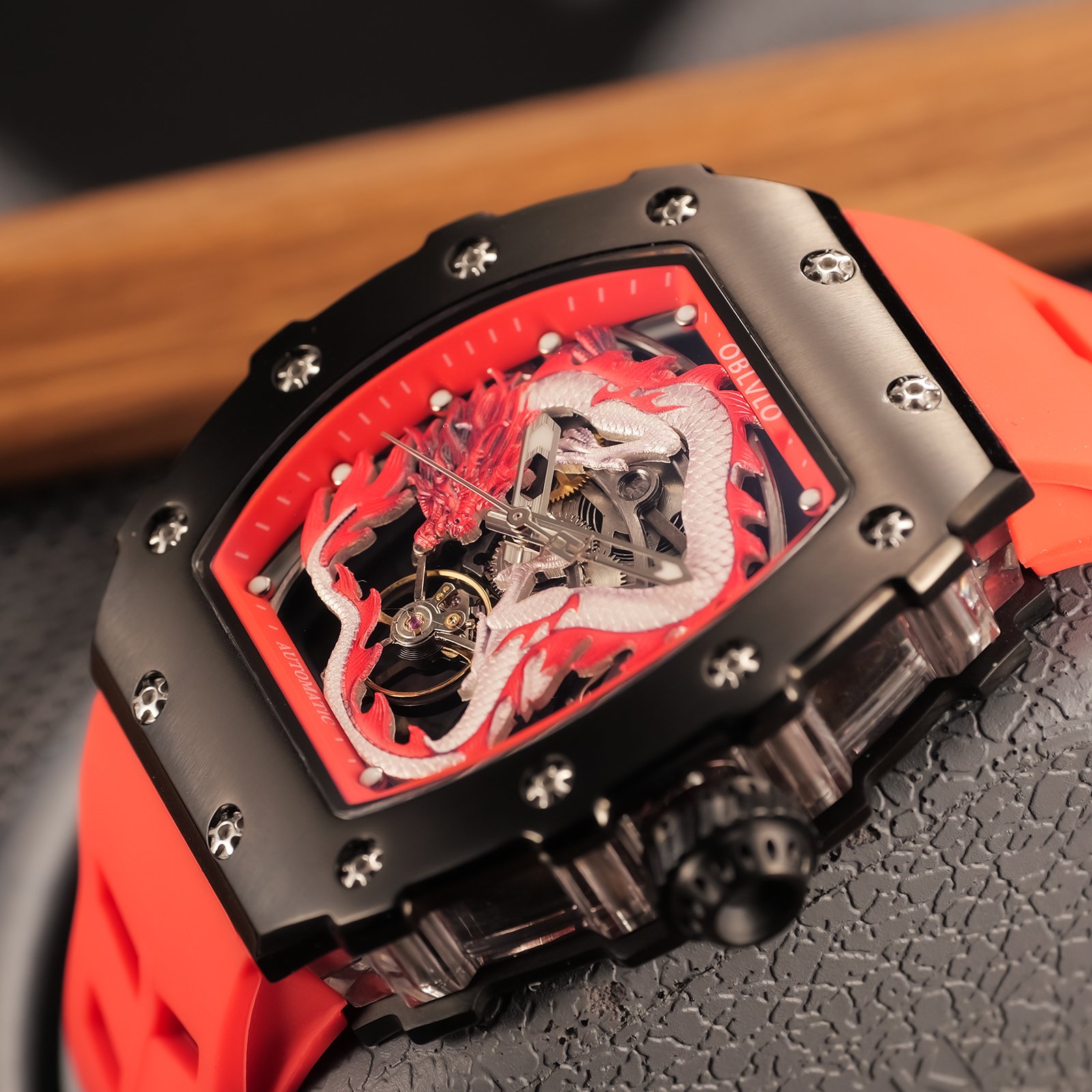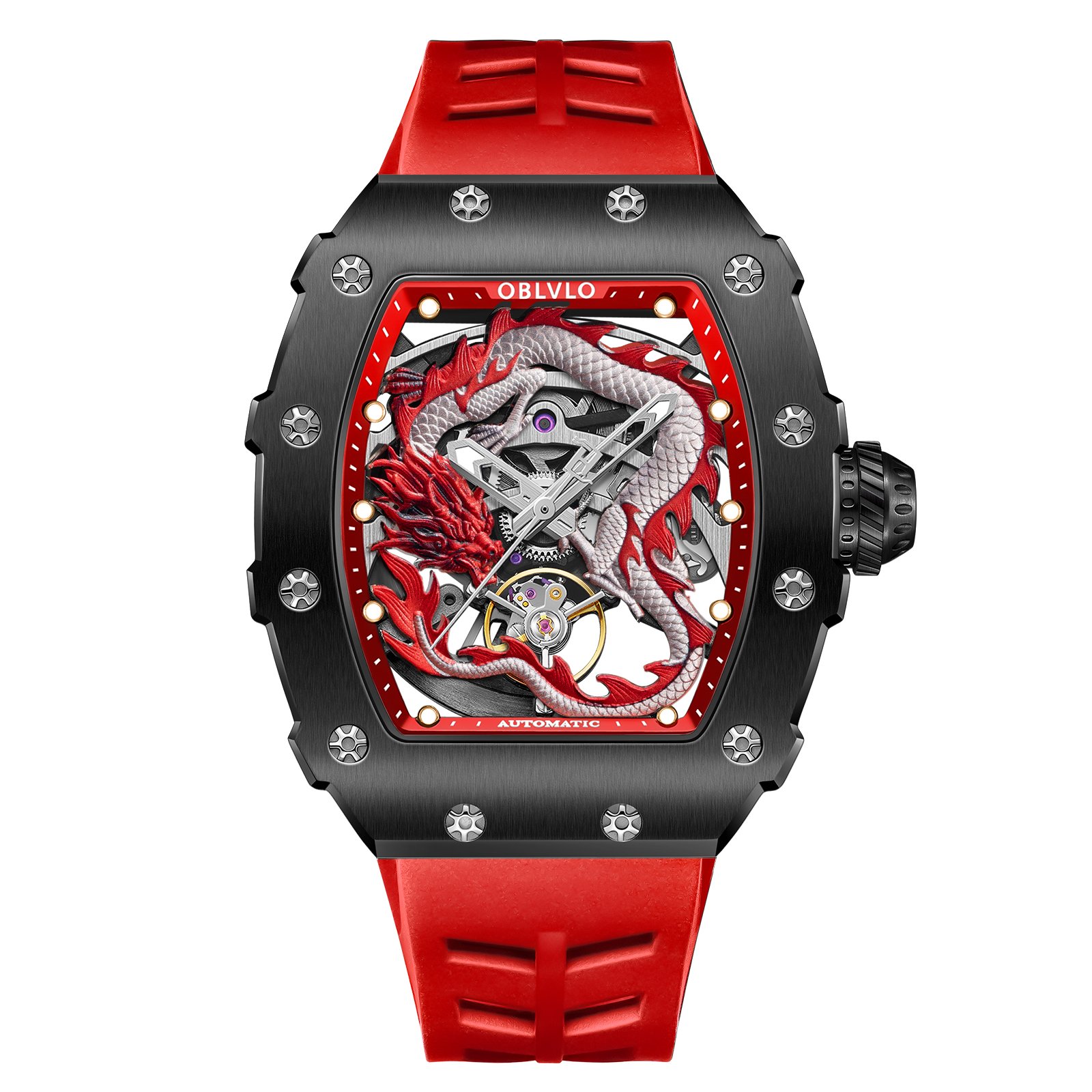 Đồng hồ OBLVLO Rồng Đỏ không chỉ là một thiết bị đo thời gian mà còn là biểu tượng của sự quyến rũ và cá tính. Với mặt số được trang trí bằng hình ảnh một con rồng mạnh mẽ, màu đỏ sôi động, chiếc đồng hồ này thu hút ánh nhìn ngay từ cái nhìn đầu tiên. Sự kết hợp tinh tế giữa chất liệu thép không gỉ và mặt kính sapphire cường lực không chỉ tạo nên vẻ bền bỉ mà còn thể hiện sự sang trọng và đẳng cấp của sản phẩm.