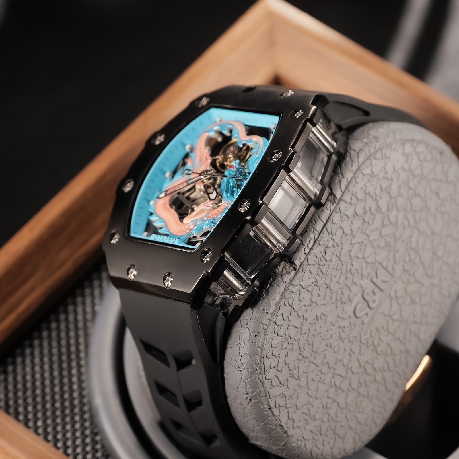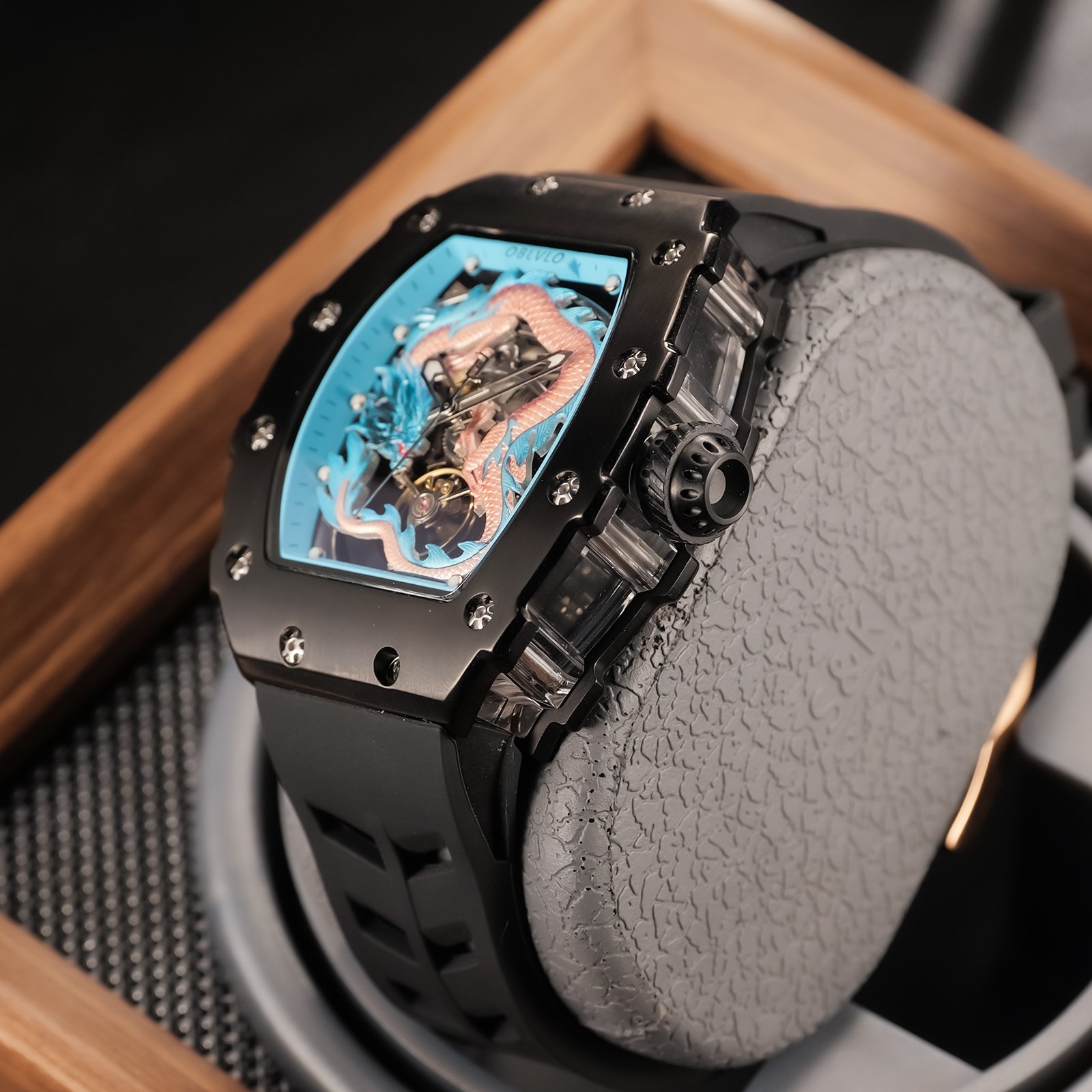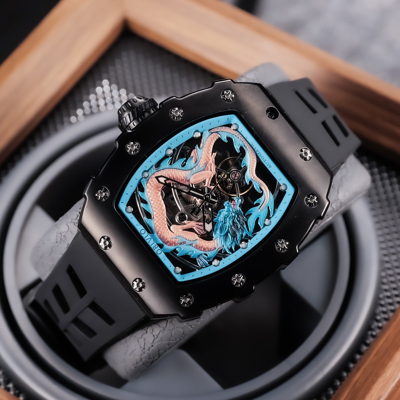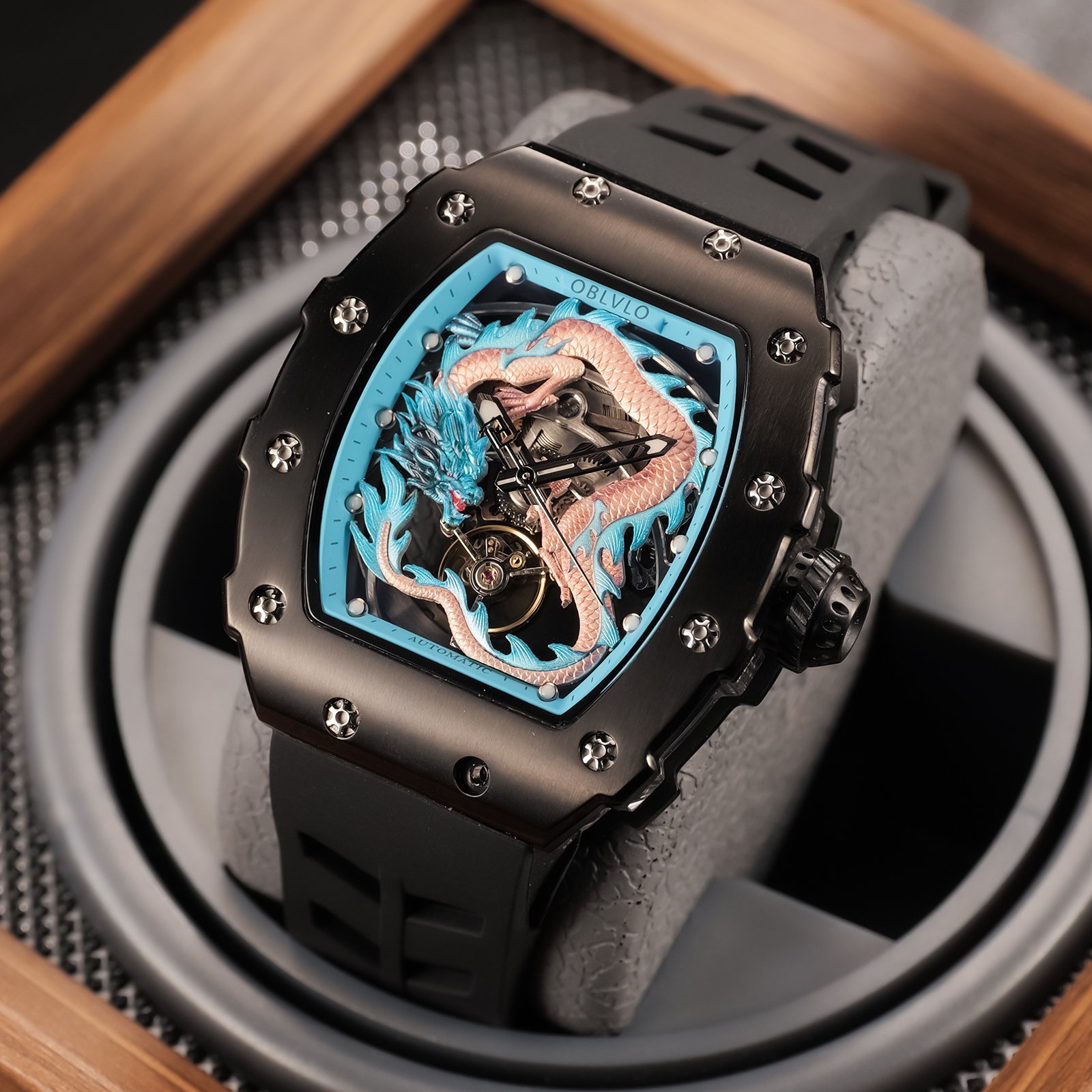Đồng hồ OBLVLO Rồng Xanh Dương không chỉ là một món đồ trang sức, mà còn là biểu tượng của sự cá tính và đẳng cấp. Với thiết kế độc đáo, mặt số được trang trí bằng hình ảnh một con rồng mạnh mẽ, màu xanh dương đậm nổi bật trên nền đen, đồng hồ này thể hiện sự mạnh mẽ và đẳng cấp của người sử dụng. Chất liệu cao cấp như thép không gỉ và mặt kính sapphire cường lực không chỉ tạo nên sự bền bỉ mà còn làm tôn lên vẻ đẹp và sự sang trọng của sản phẩm.