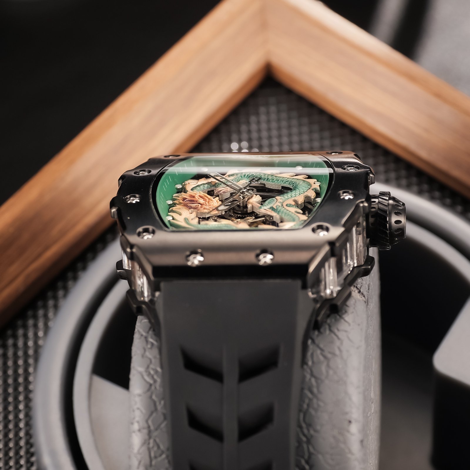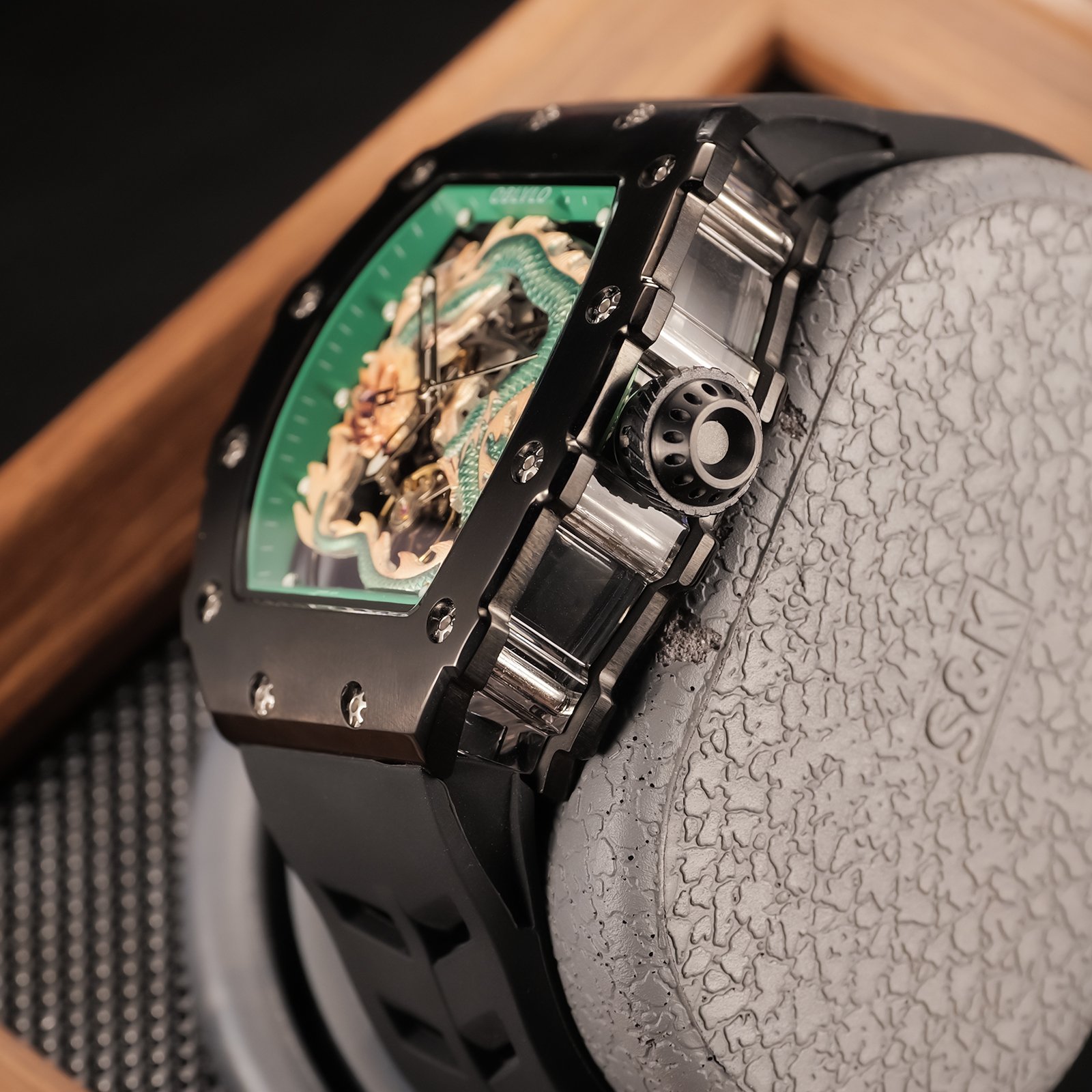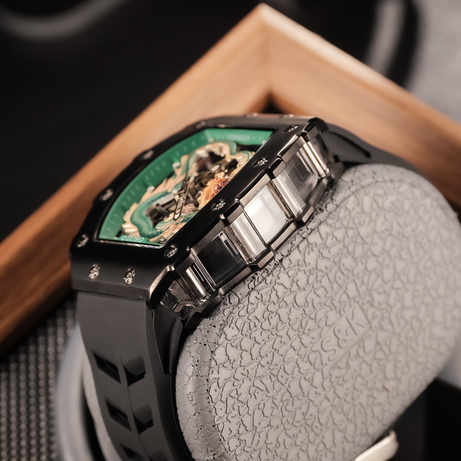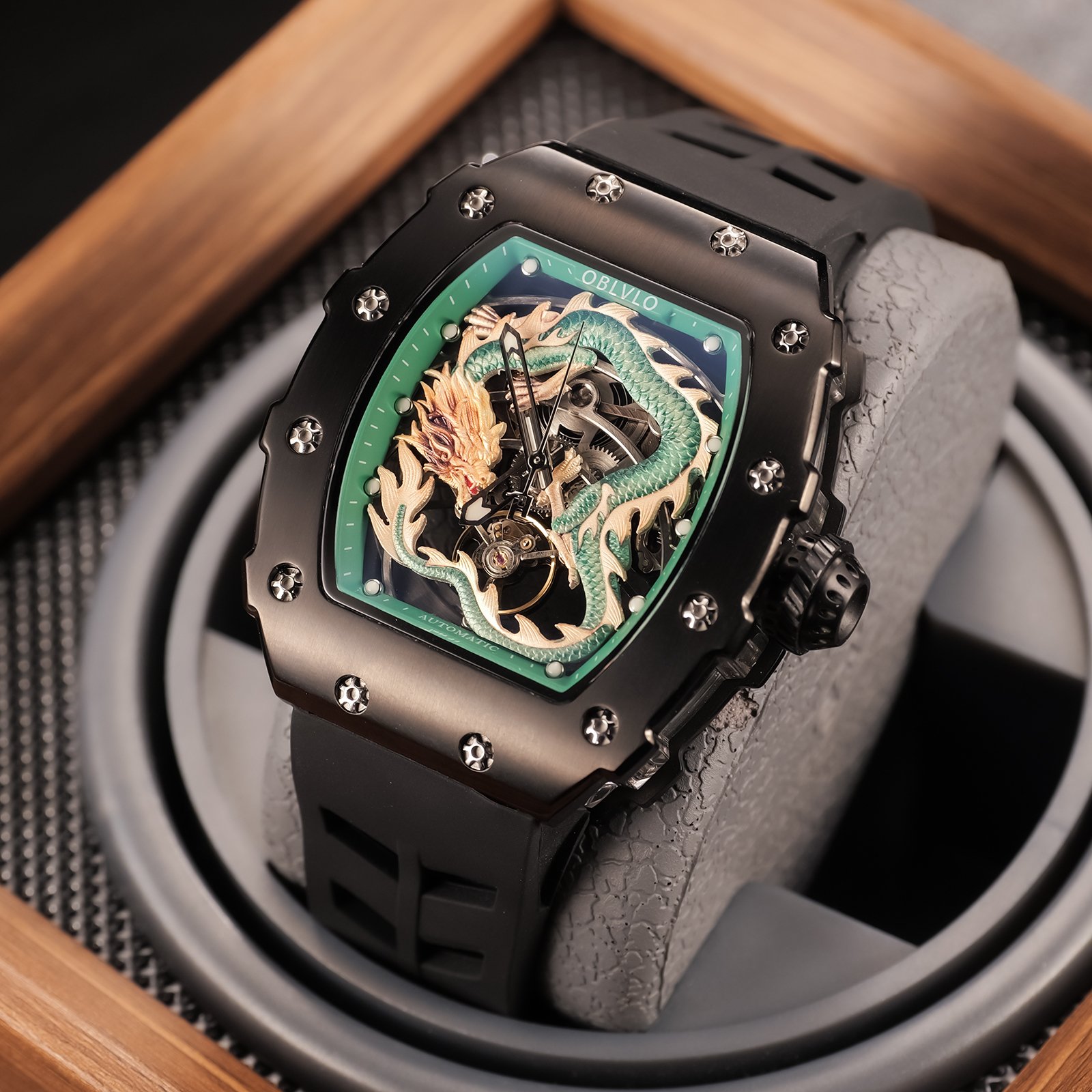 Đồng hồ OBLVLO Rồng Xanh Lá không chỉ đơn thuần là một phụ kiện đeo tay, mà còn là biểu tượng của sự cá tính, sức mạnh và cái đẹp tinh tế. Với thiết kế độc đáo, mặt số được trang trí bằng hình ảnh một con rồng uốn lượn mạnh mẽ, màu xanh lá tươi mới, đồng hồ này thu hút mọi ánh nhìn ngay từ cái nhìn đầu tiên. Bên cạnh đó, chất liệu cao cấp như thép không gỉ và mặt kính sapphire cường lực được sử dụng để tạo nên sự bền bỉ và sang trọng cho sản phẩm, đồng thời bảo vệ mặt số khỏi trầy xước và va đập.