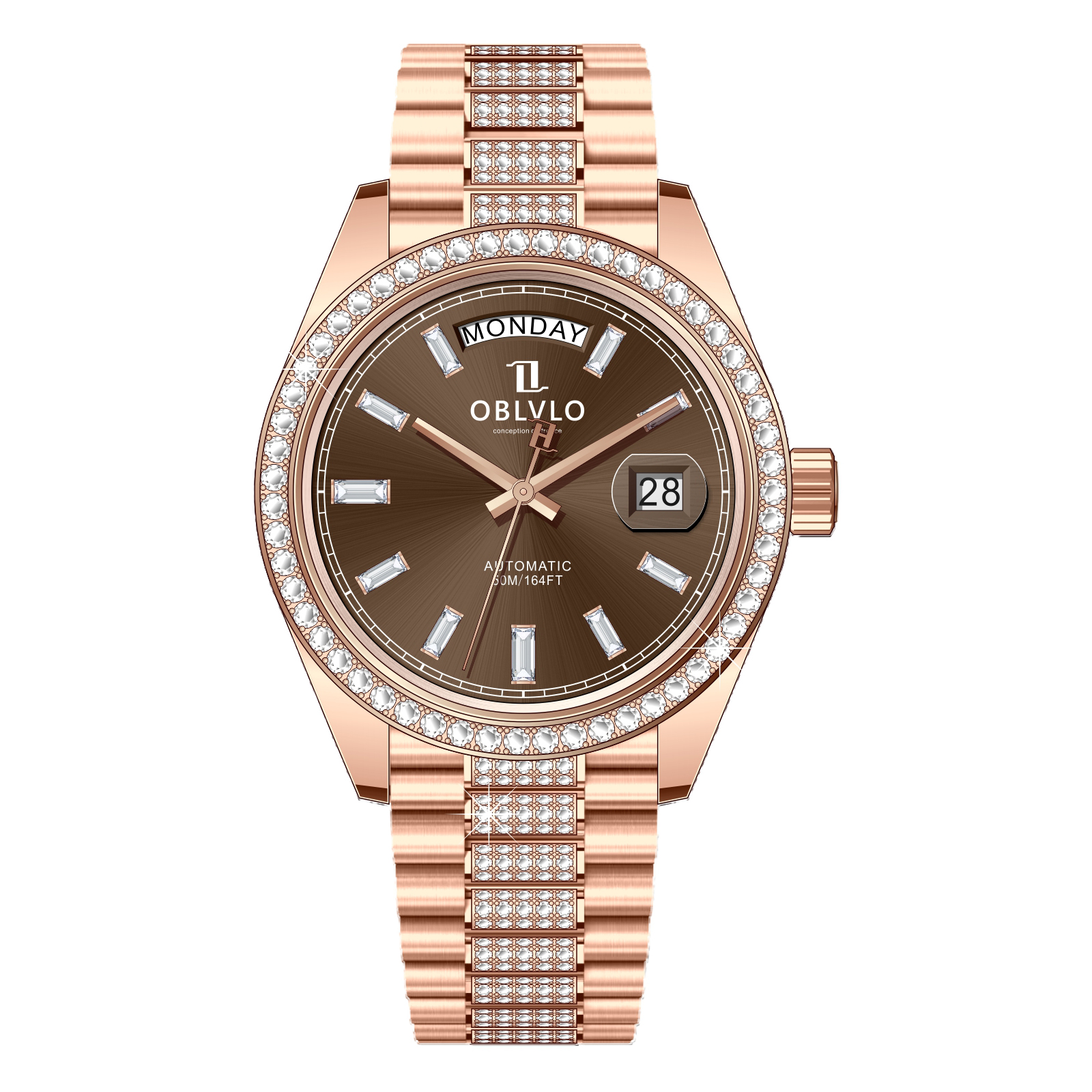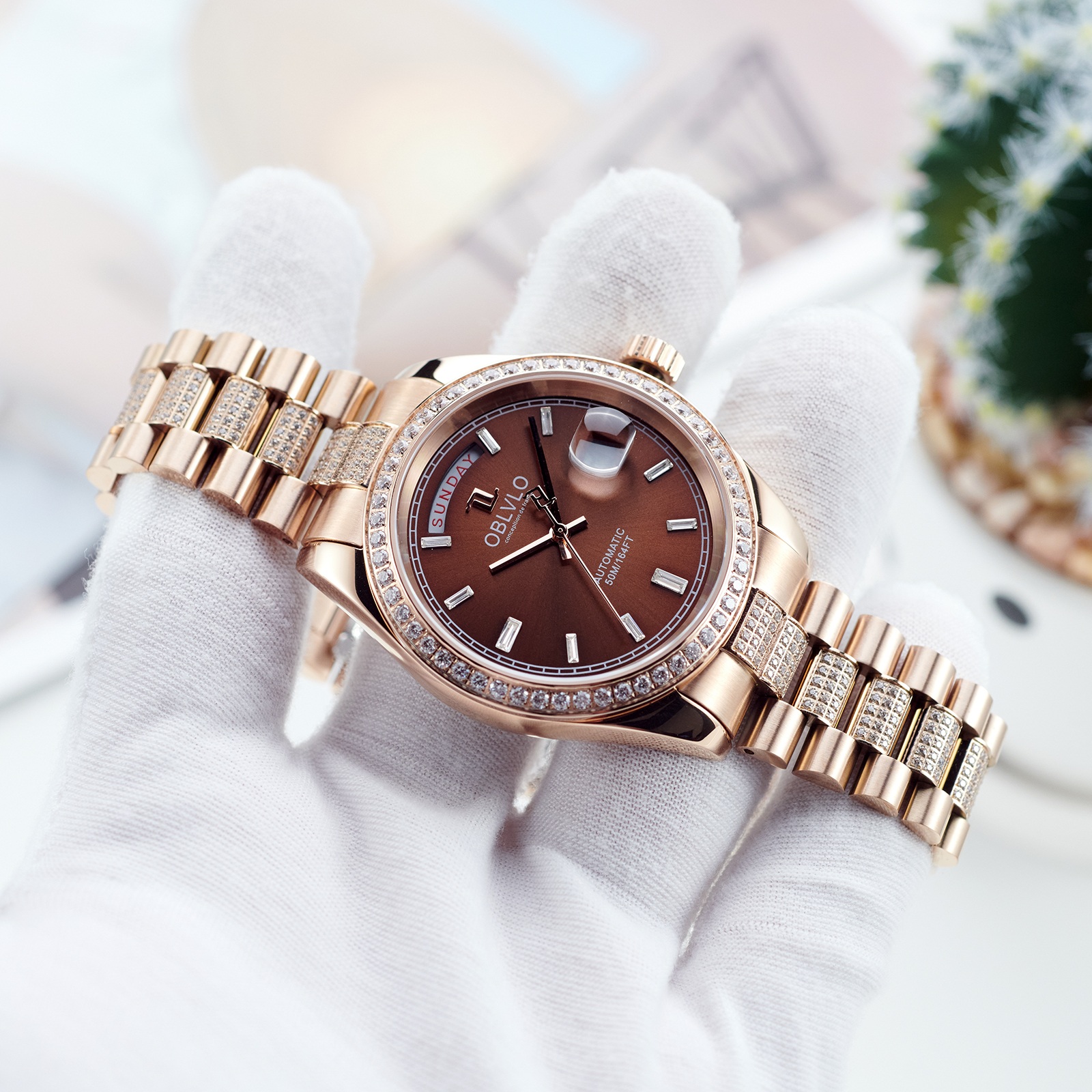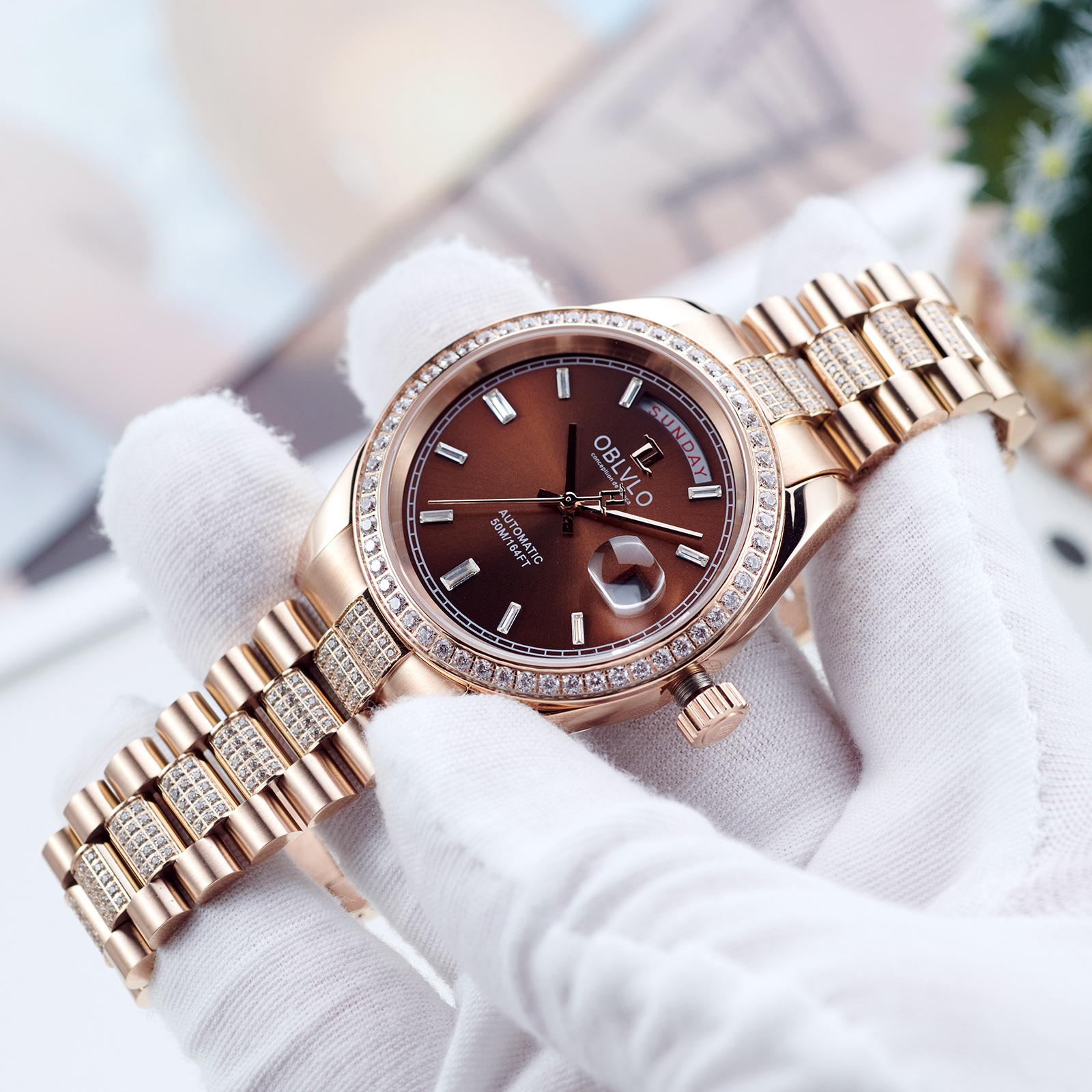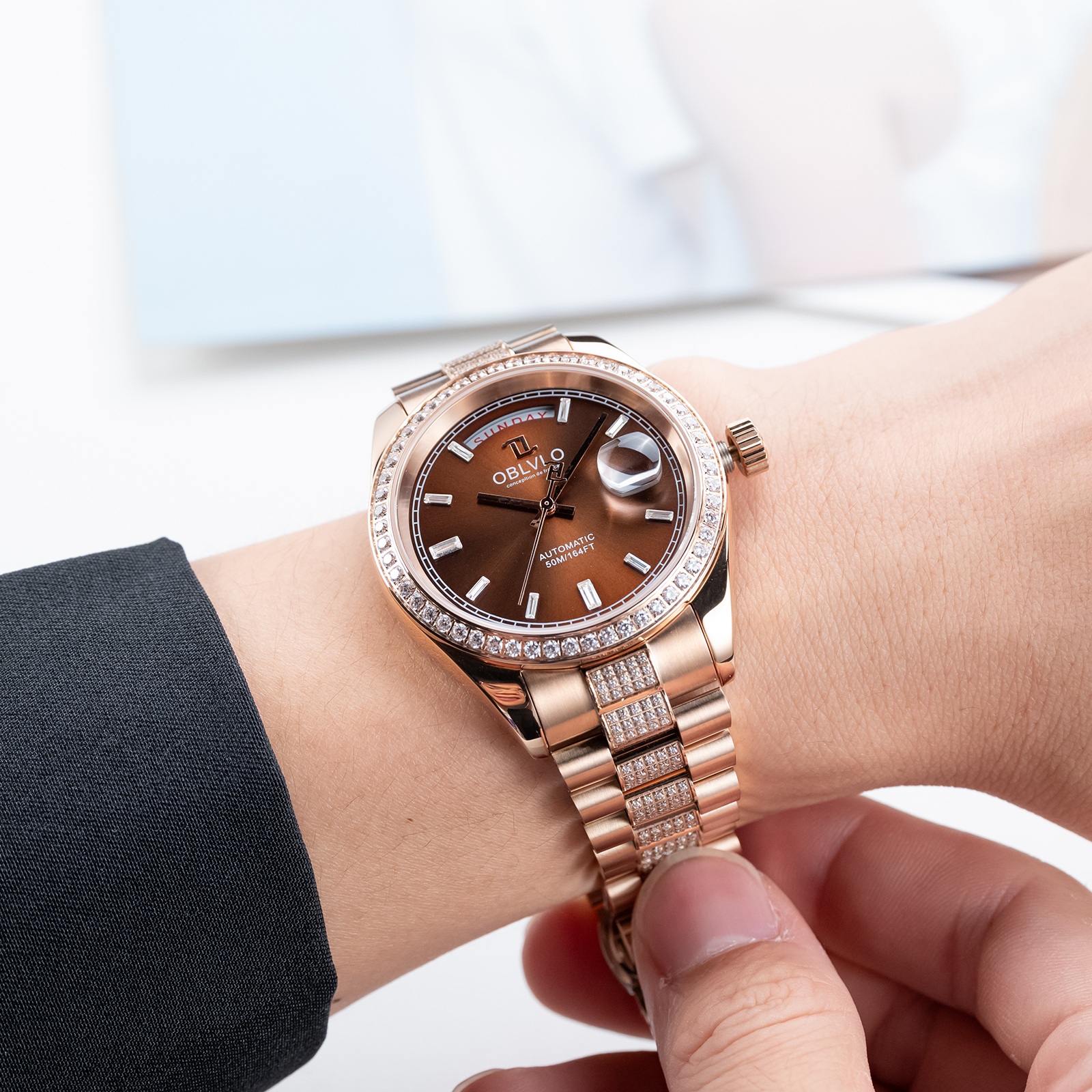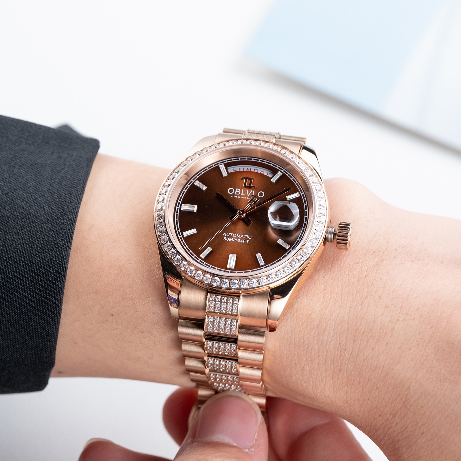 Mặt tròn là một trong những kiểu dáng đồng hồ cổ điển và được ưa chuộng nhất từ trước đến nay. Đồng hồ Oblvlo RX-DD-FD-POPS sở hữu mặt tròn với đường kính 40mm, kích thước lý tưởng phù hợp với cổ tay của đa số nam giới. Thiết kế này mang đến vẻ đẹp thanh lịch, tinh tế và dễ dàng phối hợp với nhiều phong cách trang phục khác nhau. Màu nâu viền vàng đính đá trên mặt đồng hồ tạo điểm nhấn độc đáo và thu hút, làm tăng thêm vẻ sang trọng cho sản phẩm. Kim chỉ giờ và các vạch số được thiết kế rõ ràng, giúp người dùng dễ dàng xem giờ một cách chính xác.