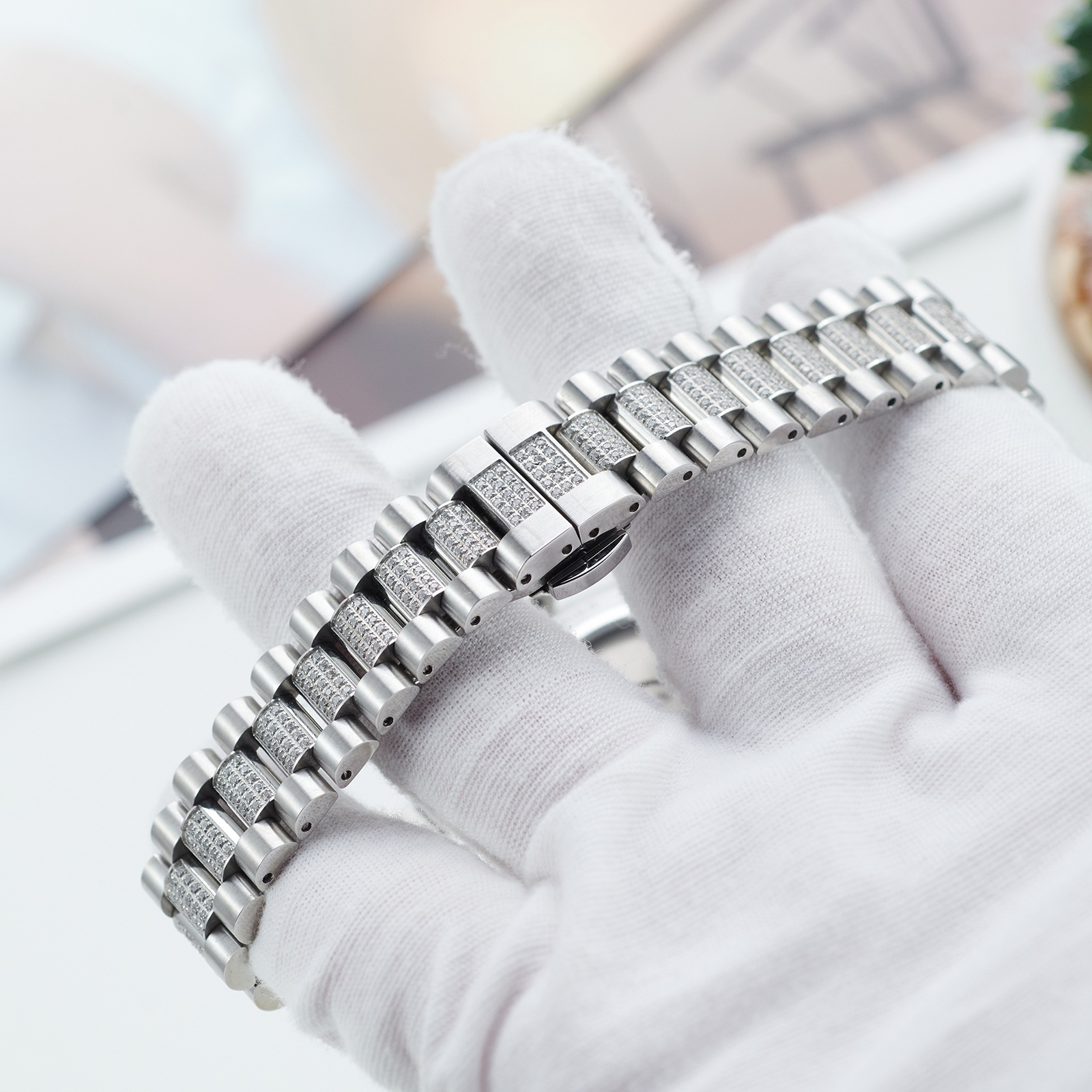 Dây đeo của đồng hồ Oblvlo RX-DD-SD-YLYS được làm từ kim loại không gỉ cao cấp, được đính đá tỉ mỉ, tạo nên vẻ đẹp sang trọng và quý phái. Dây đeo có độ bền cao, không bị gỉ sét hay phai màu theo thời gian. Thiết kế của dây đeo cũng được chú trọng đến sự thoải mái khi đeo, không gây cảm giác khó chịu hay bí bách. Các mắt xích được liên kết chặt chẽ với nhau, tạo nên sự chắc chắn và an toàn khi sử dụng. Dây đeo kim loại đính đá là một điểm nhấn quan trọng, góp phần tạo nên vẻ đẹp tổng thể của đồng hồ và làm cho nó trở nên nổi bật hơn.