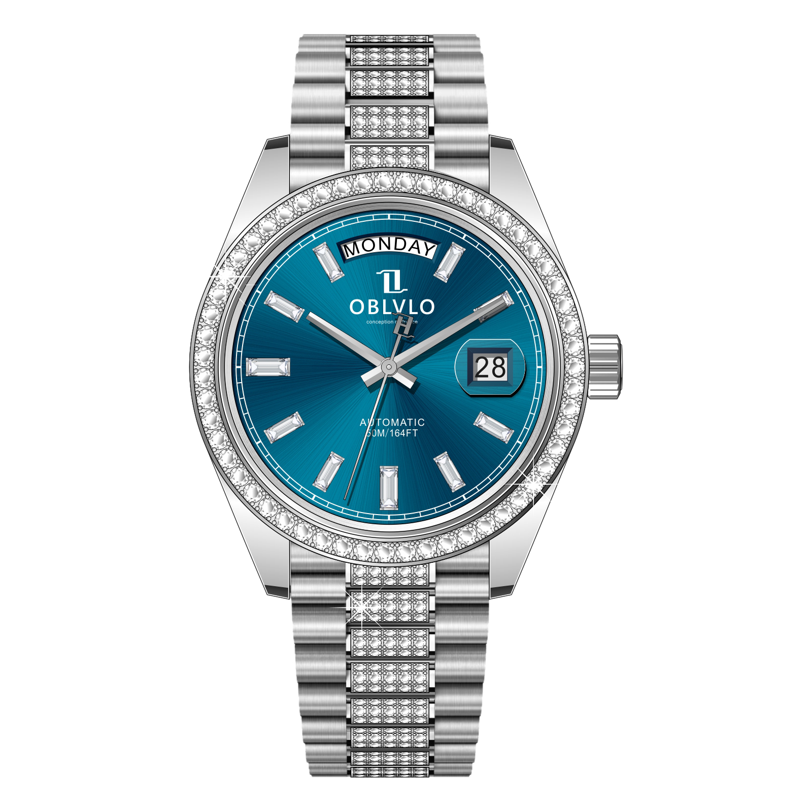Mặt số của đồng hồ Oblvlo RX-DD-SD-YLYS là một tác phẩm nghệ thuật thực sự. Với kiểu dáng tròn cổ điển, mặt số màu xanh viền trắng được tô điểm bằng những viên đá lấp lánh, tạo nên vẻ đẹp sang trọng và thu hút mọi ánh nhìn. Các chi tiết như kim chỉ giờ, phút, giây được thiết kế tỉ mỉ, sắc nét, giúp người dùng dễ dàng quan sát thời gian. Sự kết hợp hài hòa giữa màu sắc và chất liệu đã tạo nên một mặt số độc đáo, không thể nhầm lẫn với bất kỳ mẫu đồng hồ nào khác. Mặt kính sapphire chống trầy xước giúp bảo vệ mặt số luôn sáng bóng và bền đẹp theo thời gian.