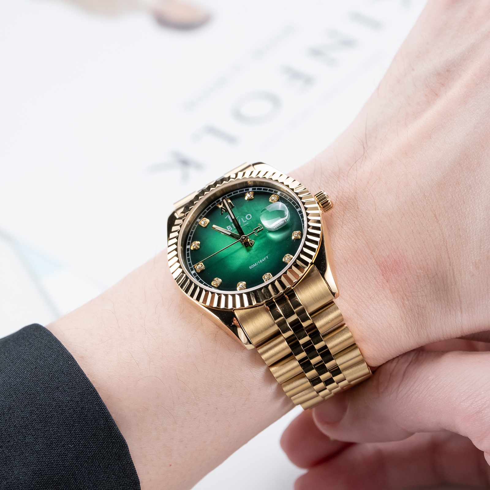Mẫu đồng hồ Oblvlo RX-PE-GGGS nổi bật với thiết kế mặt số khảm trai xanh lá viền vàng độc đáo, tạo nên vẻ đẹp sang trọng và thu hút. Vỏ đồng hồ được làm từ thép không gỉ 316L, đảm bảo độ bền và khả năng chống ăn mòn cao. Mặt kính Sapphire chống trầy xước giúp bảo vệ mặt số luôn sáng bóng và rõ nét. Dây đeo kim loại chắc chắn mang lại cảm giác thoải mái và sang trọng khi đeo. Bộ máy Swiss Quartz đảm bảo độ chính xác và ổn định trong quá trình sử dụng. Khả năng chống nước 50m cho phép người dùng thoải mái sử dụng đồng hồ trong các hoạt động hàng ngày mà không lo bị hư hỏng.