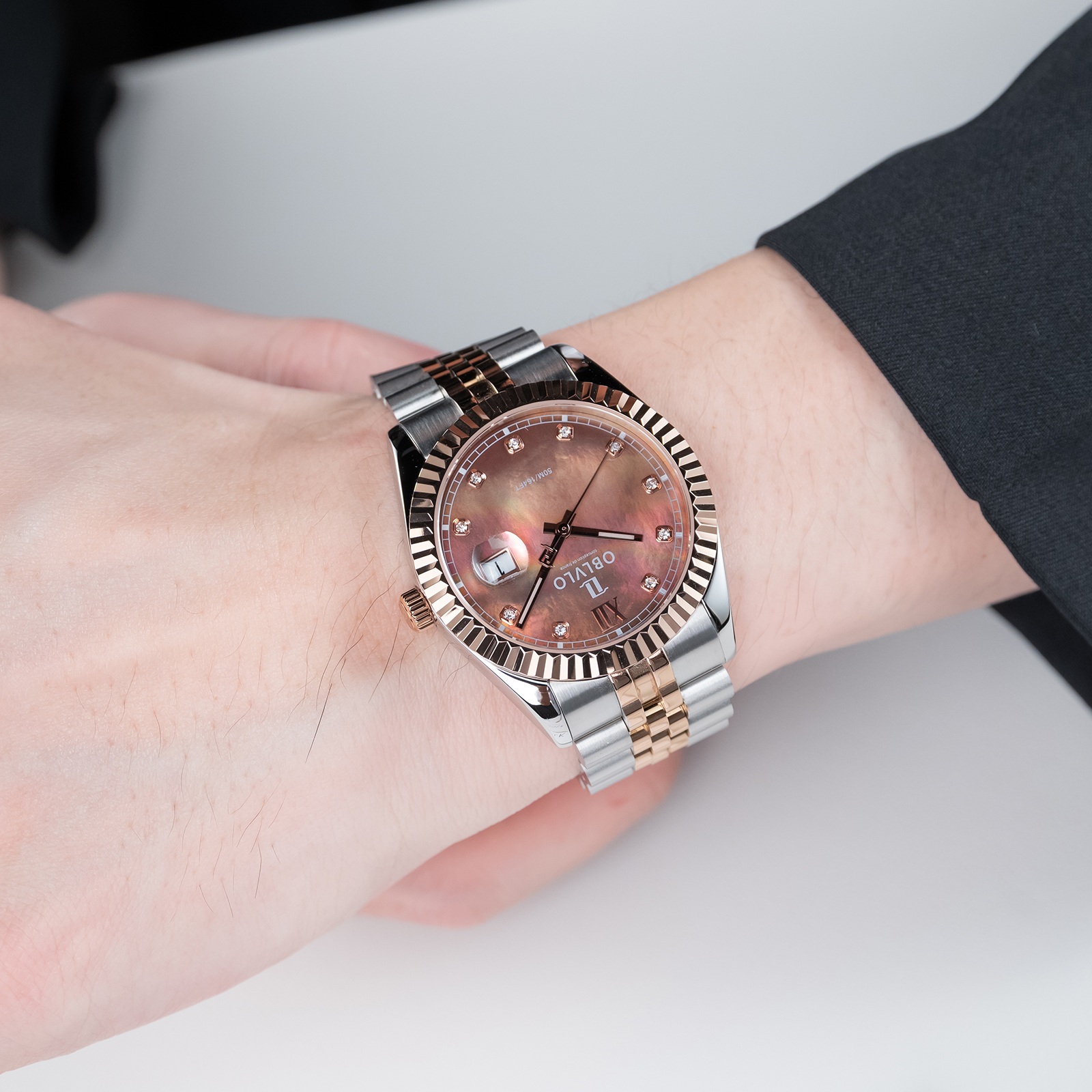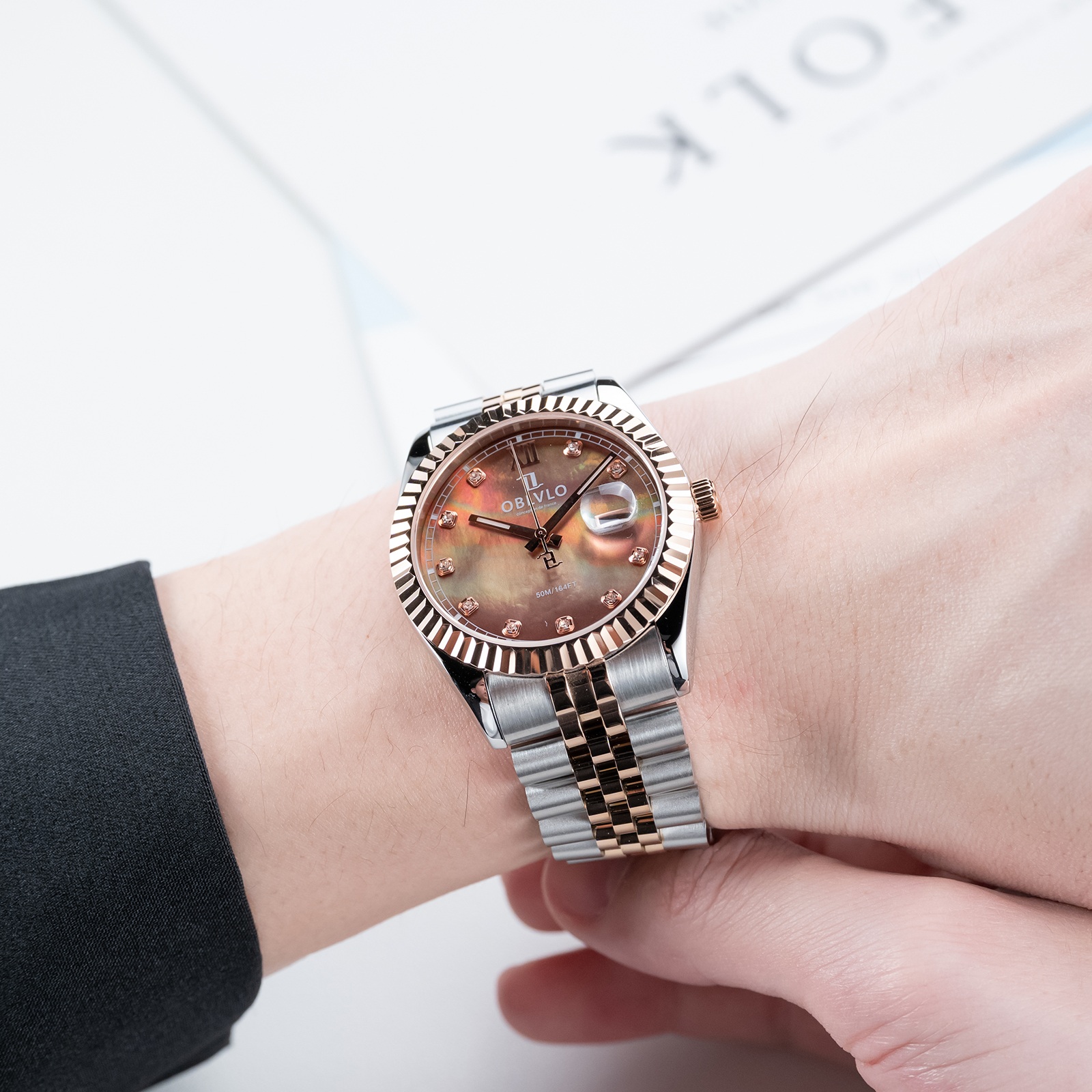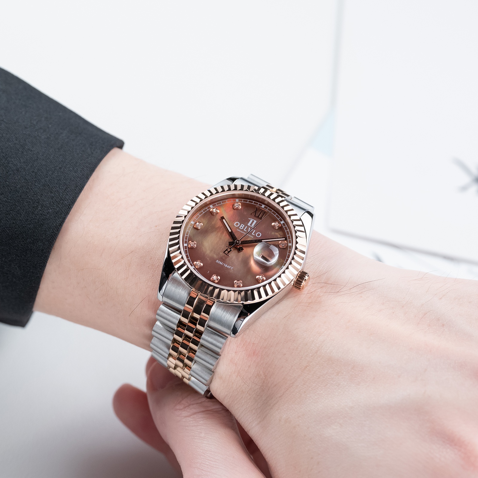 Mặt số khảm trai của đồng hồ Oblvlo RX-PE-TOPS là điểm nhấn đặc biệt, tạo nên vẻ đẹp sang trọng và quyến rũ. Khảm trai là một kỹ thuật chế tác tinh xảo, sử dụng những mảnh trai tự nhiên để tạo ra các họa tiết và màu sắc độc đáo trên mặt số. Mỗi chiếc đồng hồ có một mặt số khảm trai riêng biệt, không chiếc nào giống chiếc nào, làm tăng thêm giá trị và tính độc bản của sản phẩm. Màu nâu viền vàng kết hợp với khảm trai tạo nên một tổng thể hài hòa, vừa cổ điển vừa hiện đại, phù hợp với nhiều phong cách thời trang khác nhau. Sự tỉ mỉ trong từng chi tiết khảm trai thể hiện sự tâm huyết và kỹ năng của những người thợ lành nghề.
