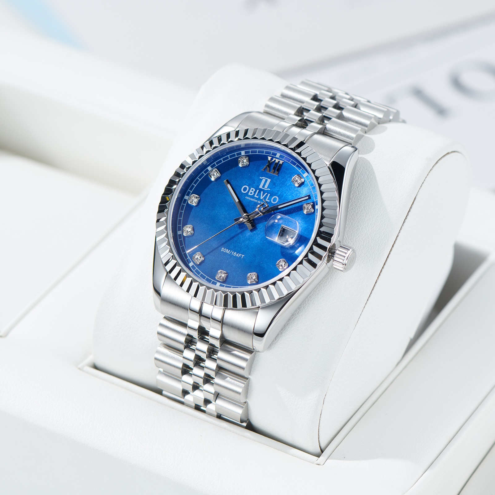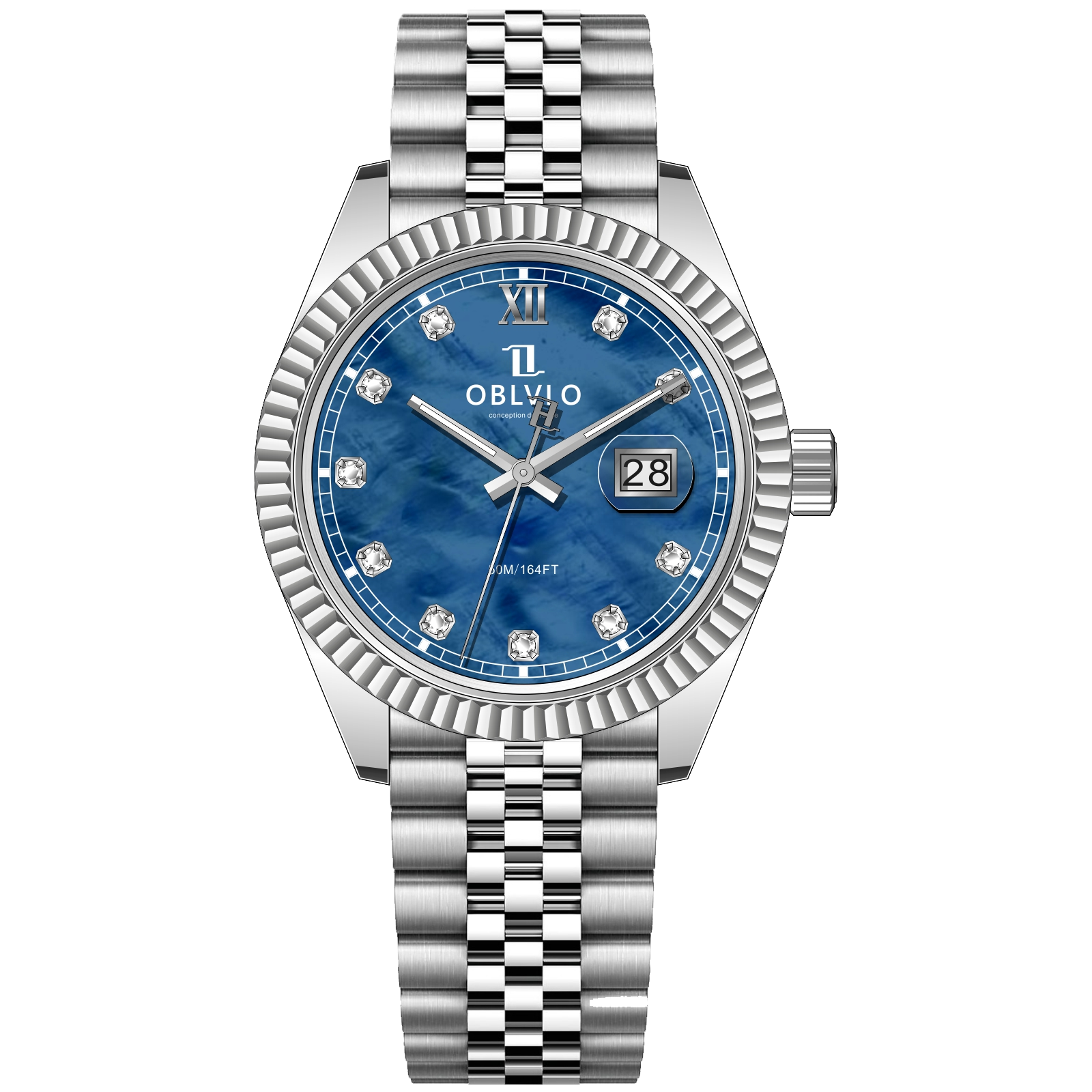 Điểm nhấn đặc biệt của đồng hồ Oblvlo RX-PE-YLYS chính là mặt số khảm trai độc đáo. Khảm trai là một kỹ thuật trang trí lâu đời, sử dụng những mảnh vỏ trai tự nhiên để tạo ra các họa tiết và màu sắc lấp lánh. Trên mặt số của chiếc đồng hồ này, các nghệ nhân đã khéo léo sắp xếp những mảnh khảm trai màu xanh viền trắng, tạo nên một bức tranh sống động và đầy cuốn hút. Mỗi chiếc đồng hồ Oblvlo RX-PE-YLYS đều có một mặt số khảm trai riêng biệt, không chiếc nào giống chiếc nào, mang đến cho người đeo một món đồ độc nhất vô nhị. Sự kết hợp giữa khảm trai và các chi tiết kim loại được gia công tỉ mỉ tạo nên một tổng thể hài hòa và sang trọng.