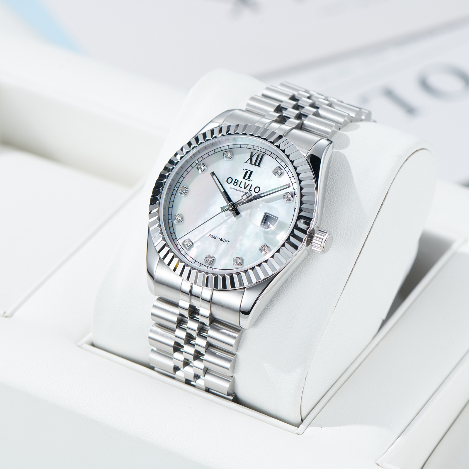Đồng hồ Oblvlo RX-PE-YWYS Swiss Quartz khảm trai gây ấn tượng mạnh mẽ ngay từ cái nhìn đầu tiên với thiết kế mặt tròn cổ điển, mang đến vẻ đẹp thanh lịch và nam tính. Điểm nhấn đặc biệt của chiếc đồng hồ này là mặt số khảm trai màu trắng, tạo hiệu ứng ánh sáng lấp lánh và độc đáo, thu hút mọi ánh nhìn. Các chi tiết kim và vạch chỉ giờ được thiết kế tỉ mỉ, sắc nét, góp phần tăng thêm vẻ sang trọng và đẳng cấp cho sản phẩm. Vỏ đồng hồ được làm từ thép không gỉ 316L cao cấp, đảm bảo độ bền và khả năng chống ăn mòn, giúp chiếc đồng hồ luôn giữ được vẻ đẹp như mới theo thời gian. Dây đeo kim loại với các mắt xích được liên kết chặt chẽ, tạo cảm giác thoải mái và chắc chắn khi đeo.
