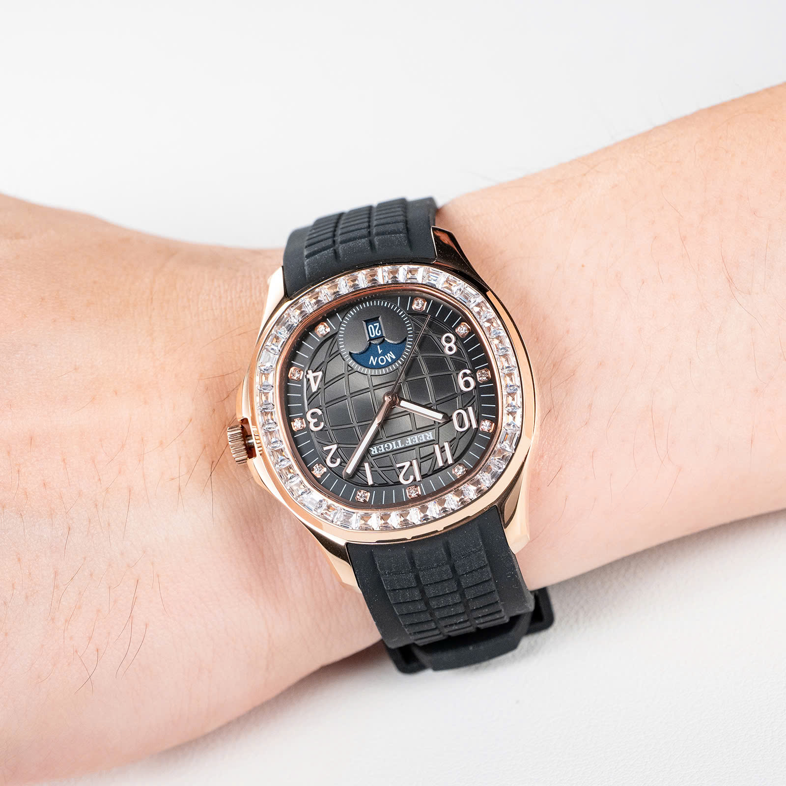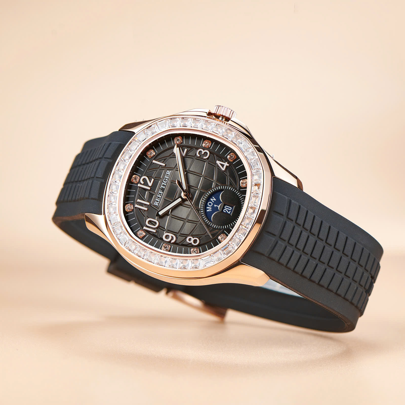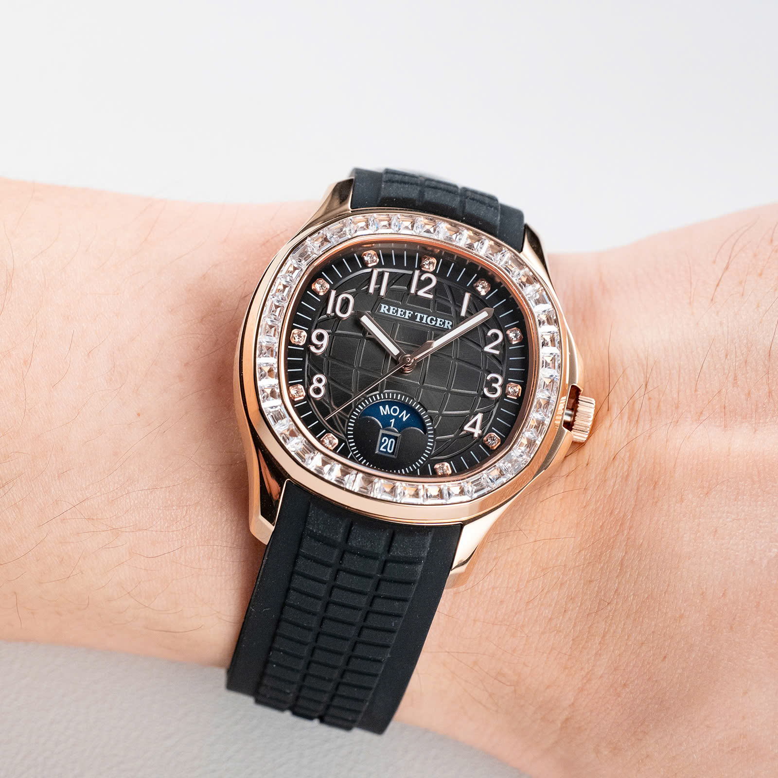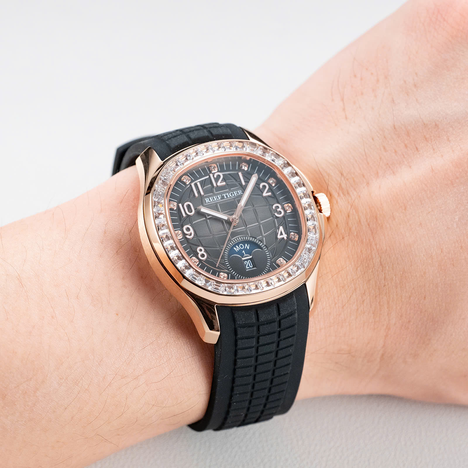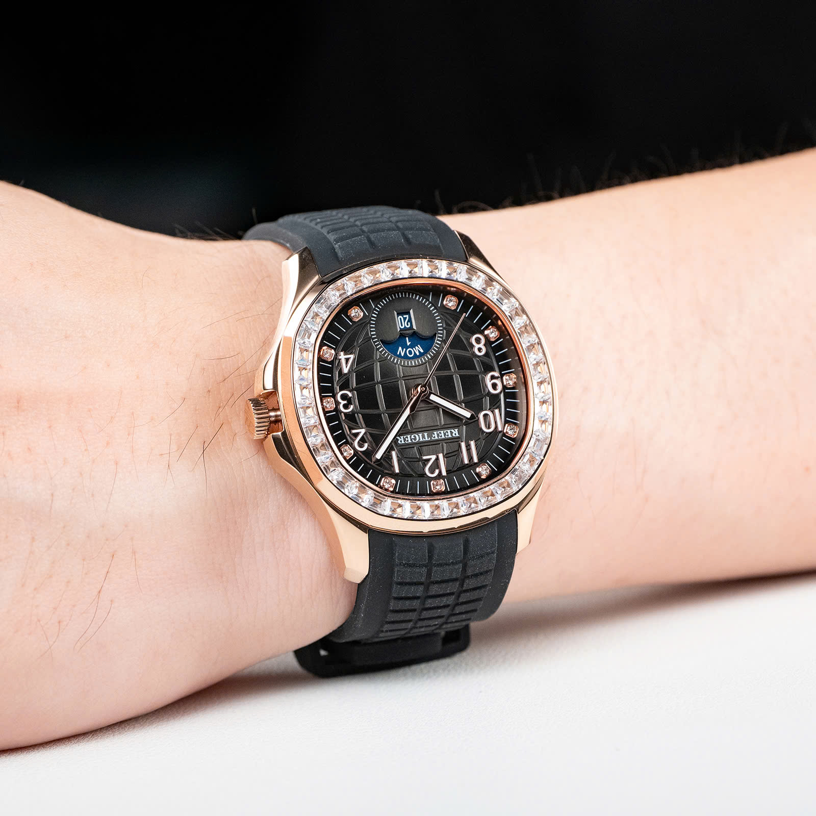 Đồng hồ nam **Reef Tiger RGA1805-PBBRD** mang vẻ đẹp bí ẩn và mạnh mẽ với thiết kế mặt đen ấn tượng, kết hợp cùng những viên đá quý tinh xảo đính quanh viền, tạo nên sự sang trọng đầy cuốn hút. Vỏ thép không gỉ cao cấp và dây đeo silicone mềm mại không chỉ mang lại cảm giác thoải mái mà còn đảm bảo độ bền vượt trội. Mặt kính sapphire chống trầy xước giúp bảo vệ đồng hồ trước các tác động bên ngoài, giữ cho sản phẩm luôn mới mẻ và sáng bóng. Được trang bị bộ máy automatic chính xác, Reef Tiger RGA1805-PBBRD là biểu tượng của sự ổn định và tin cậy. Đây là phụ kiện hoàn hảo cho những quý ông yêu thích sự thanh lịch và muốn thể hiện phong cách nam tính, bí ẩn của mình.