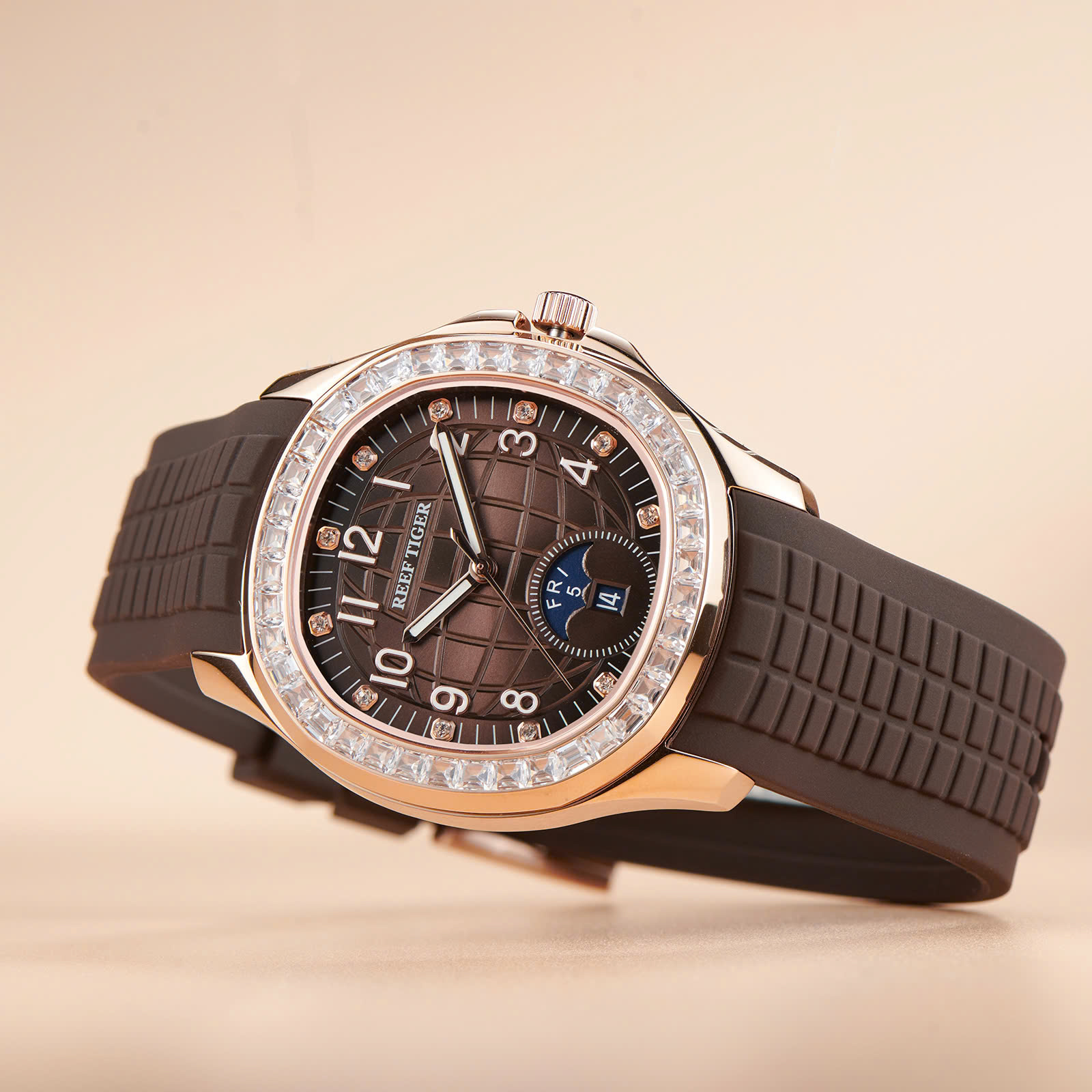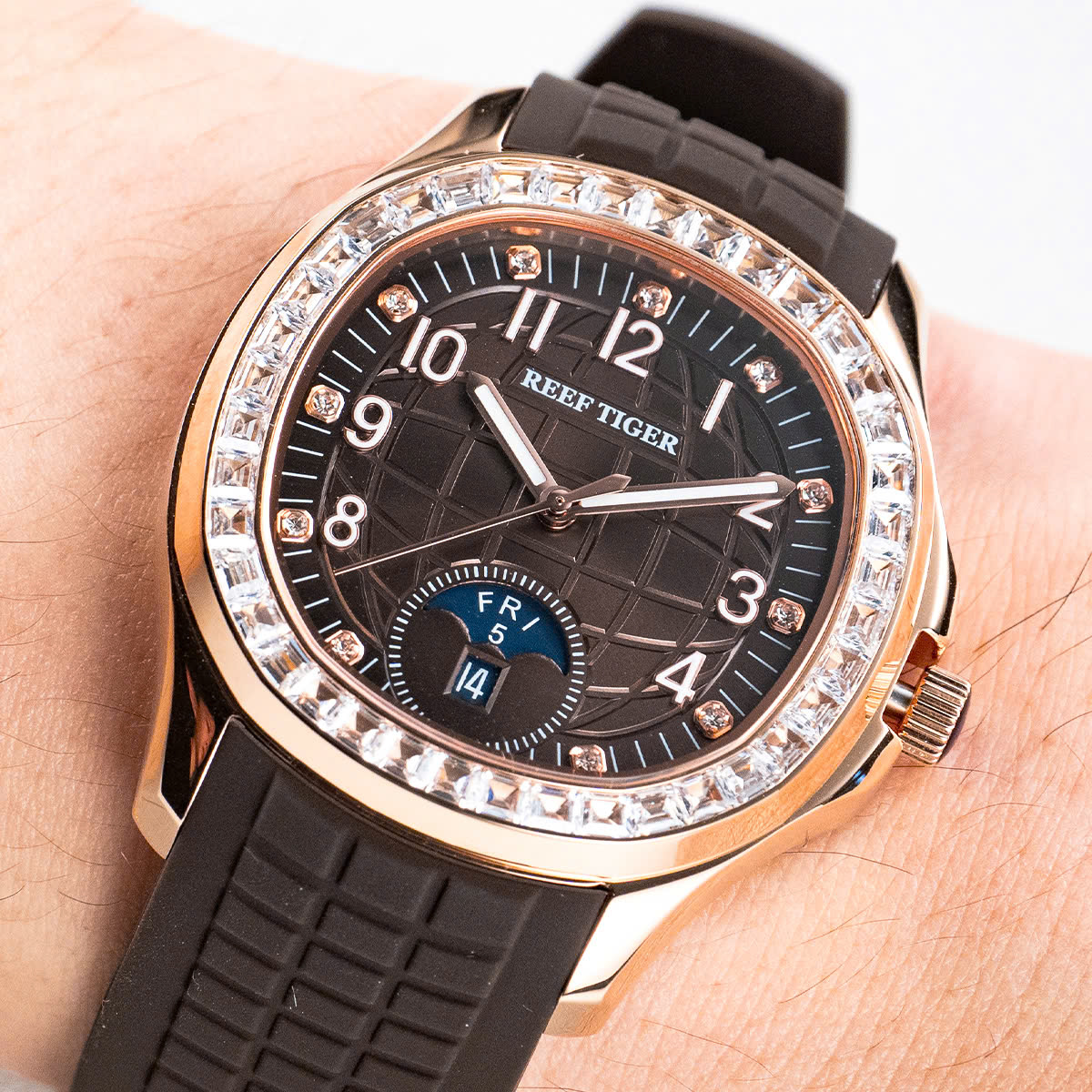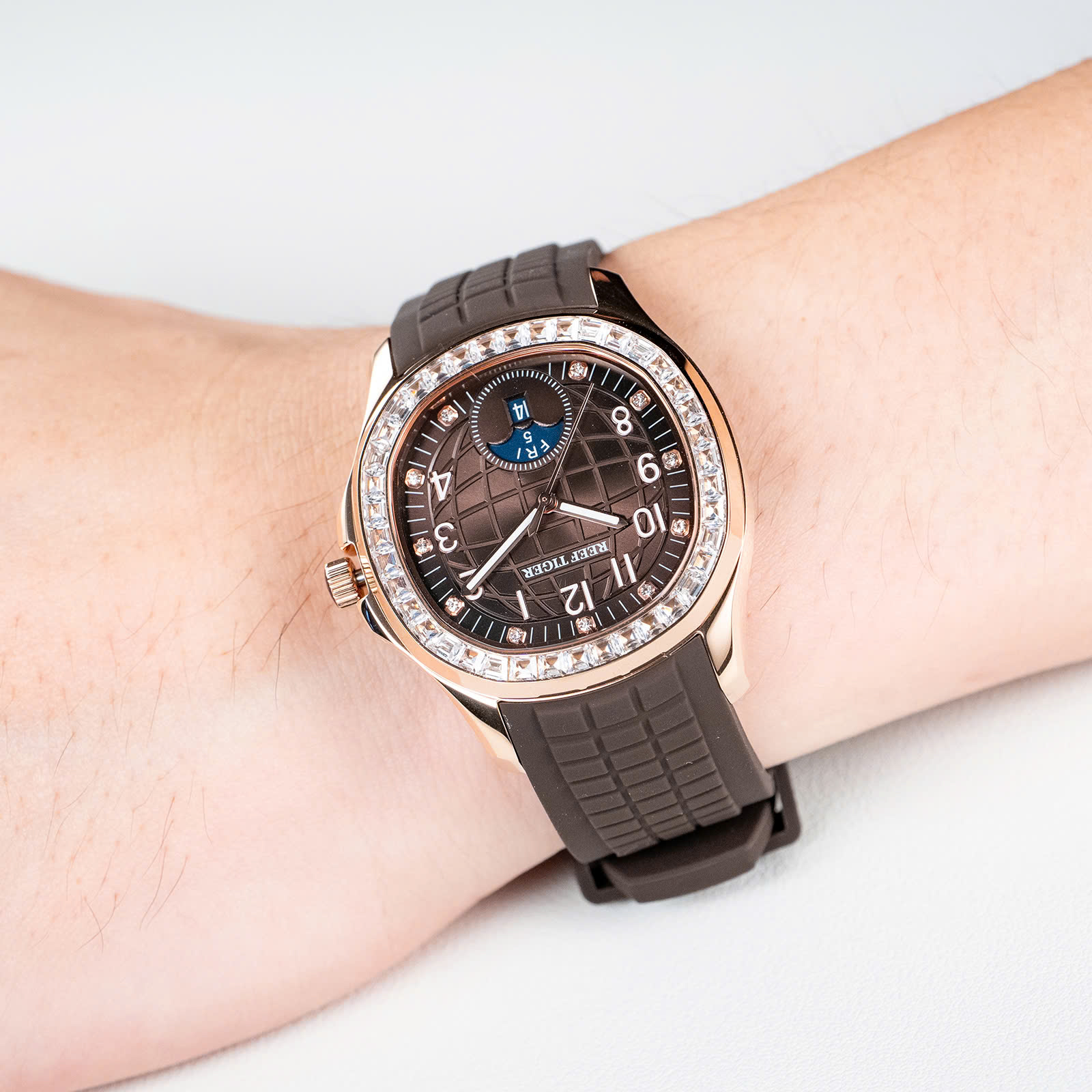 Đồng hồ nam **Reef Tiger RGA1805-PBRBD** nổi bật với thiết kế tinh tế và sang trọng, kết hợp hài hòa giữa tông màu nâu ấm áp và những viên đá quý đính quanh viền, tạo nên một vẻ đẹp cuốn hút đầy nam tính. Vỏ thép không gỉ cao cấp cùng dây đeo silicone mềm mại, mang lại cảm giác thoải mái và độ bền bỉ trong quá trình sử dụng. Mặt kính sapphire chống trầy xước giúp đồng hồ luôn giữ được vẻ sáng bóng và mới mẻ. Với bộ máy automatic chất lượng cao, Reef Tiger RGA1805-PBRBD đảm bảo sự chính xác và tin cậy trong mọi hoạt động. Đây là phụ kiện hoàn hảo cho quý ông muốn khẳng định phong cách lịch lãm, mạnh mẽ và đẳng cấp của mình.