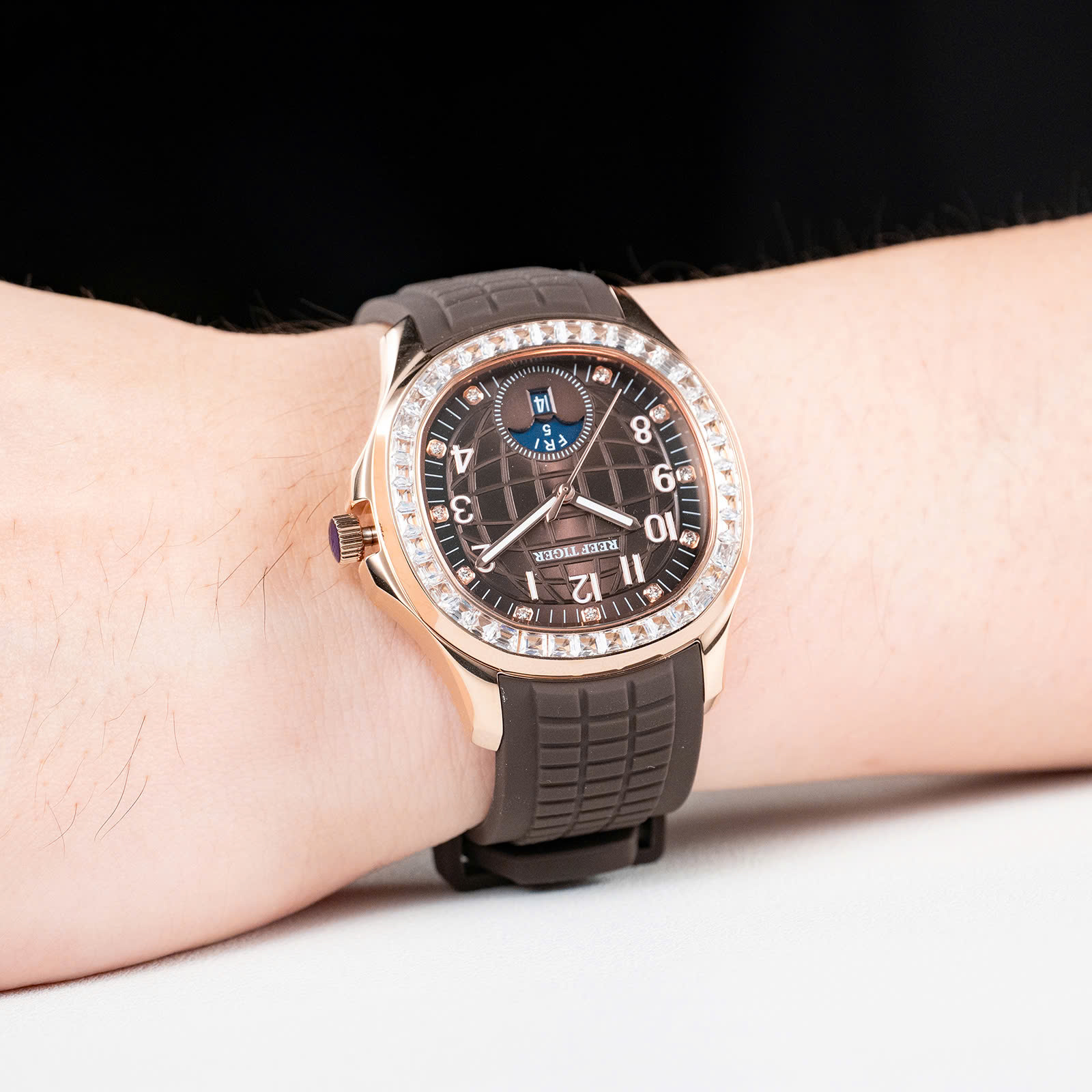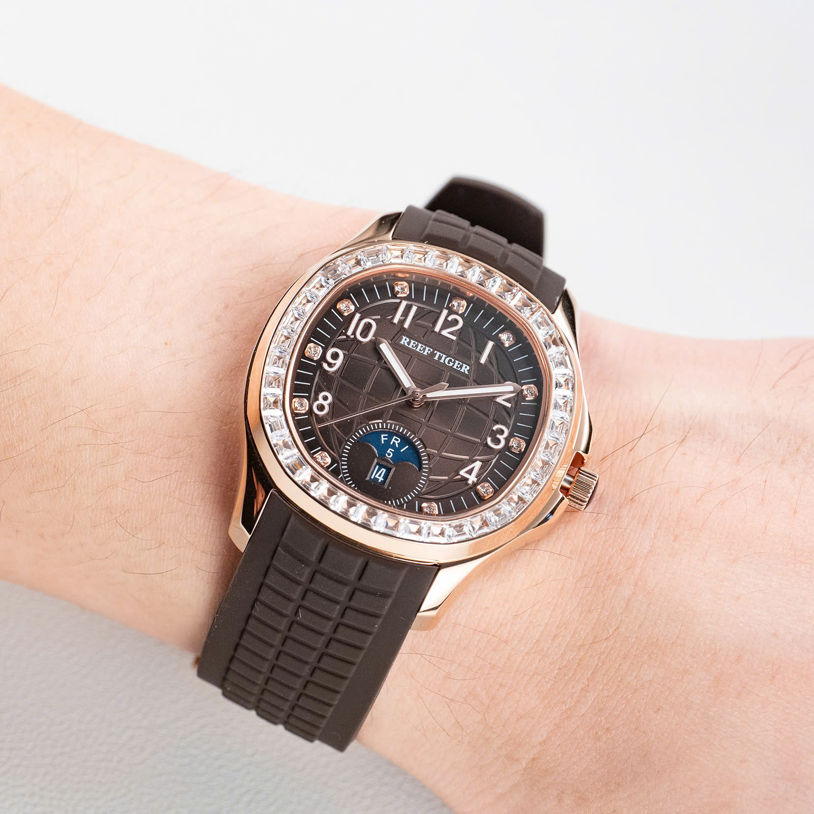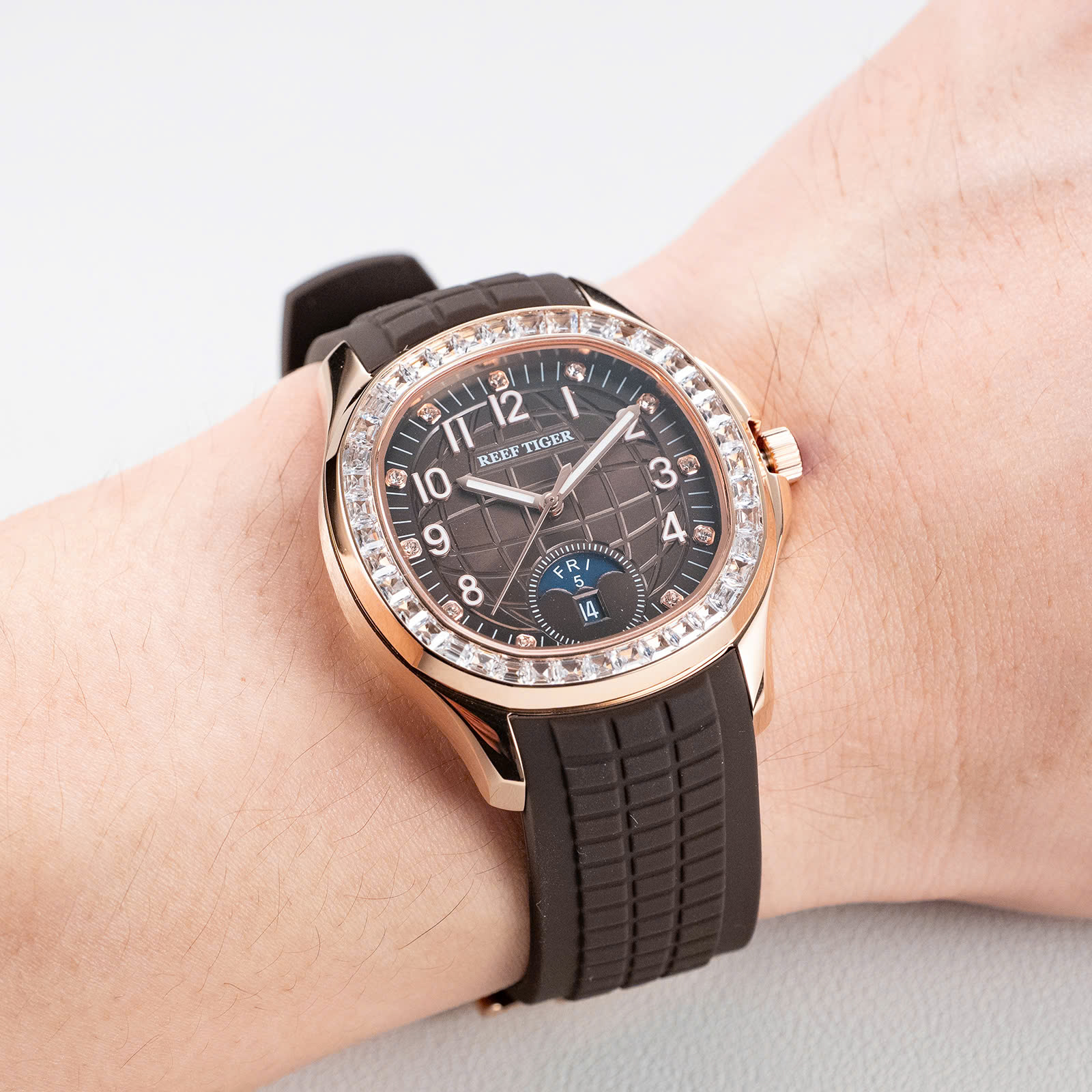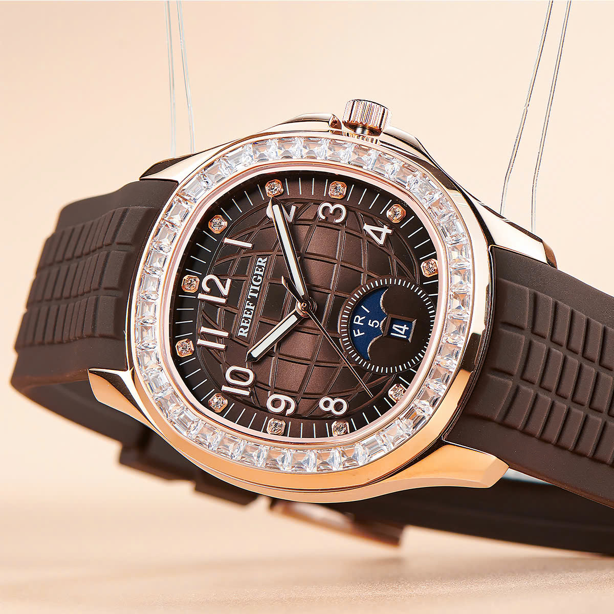 Đồng hồ nam **Reef Tiger RGA1805-PBRBD** nổi bật với thiết kế tinh tế và sang trọng, kết hợp hài hòa giữa tông màu nâu ấm áp và những viên đá quý đính quanh viền, tạo nên một vẻ đẹp cuốn hút đầy nam tính. Vỏ thép không gỉ cao cấp cùng dây đeo silicone mềm mại, mang lại cảm giác thoải mái và độ bền bỉ trong quá trình sử dụng. Mặt kính sapphire chống trầy xước giúp đồng hồ luôn giữ được vẻ sáng bóng và mới mẻ. Với bộ máy automatic chất lượng cao, Reef Tiger RGA1805-PBRBD đảm bảo sự chính xác và tin cậy trong mọi hoạt động. Đây là phụ kiện hoàn hảo cho quý ông muốn khẳng định phong cách lịch lãm, mạnh mẽ và đẳng cấp của mình.
