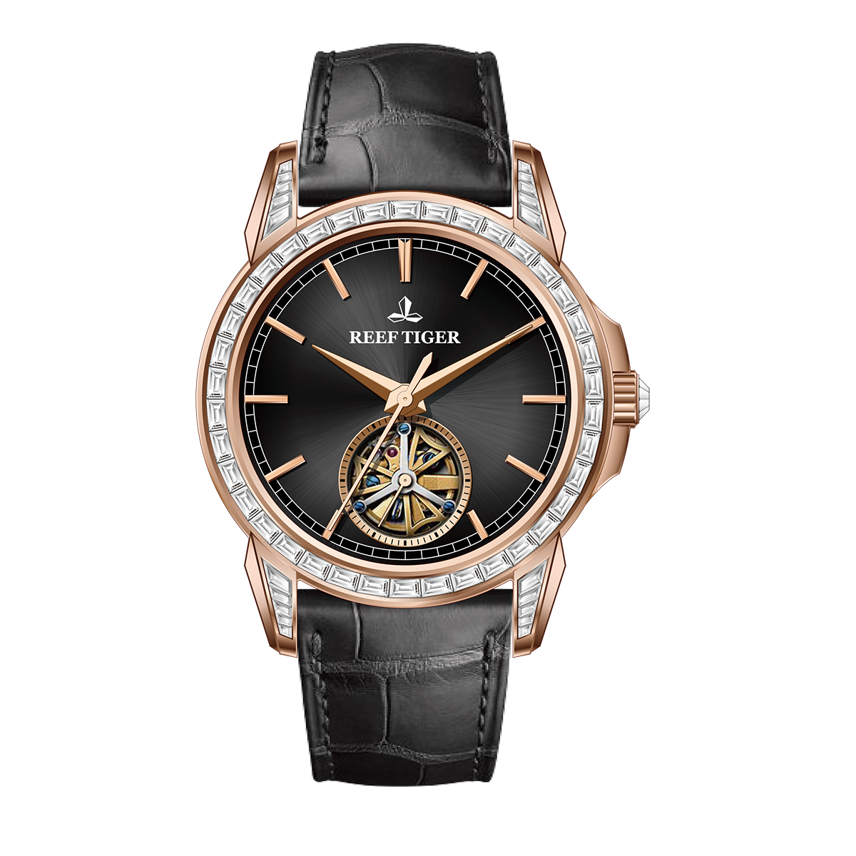 Reef Tiger RGA1904 gây ấn tượng mạnh mẽ ngay từ cái nhìn đầu tiên với thiết kế mặt số tròn cổ điển, kết hợp cùng các chi tiết đính đá tỉ mỉ. Sự kết hợp này tạo nên một vẻ đẹp sang trọng, lịch lãm, phù hợp với nhiều phong cách thời trang khác nhau. Các kim chỉ giờ và vạch số được thiết kế tinh tế, dễ đọc, đồng thời tăng thêm vẻ đẹp thẩm mỹ cho chiếc đồng hồ. Vỏ đồng hồ được làm từ thép không gỉ 316L cao cấp, đảm bảo độ bền và khả năng chống ăn mòn, giữ cho chiếc đồng hồ luôn sáng bóng theo thời gian.