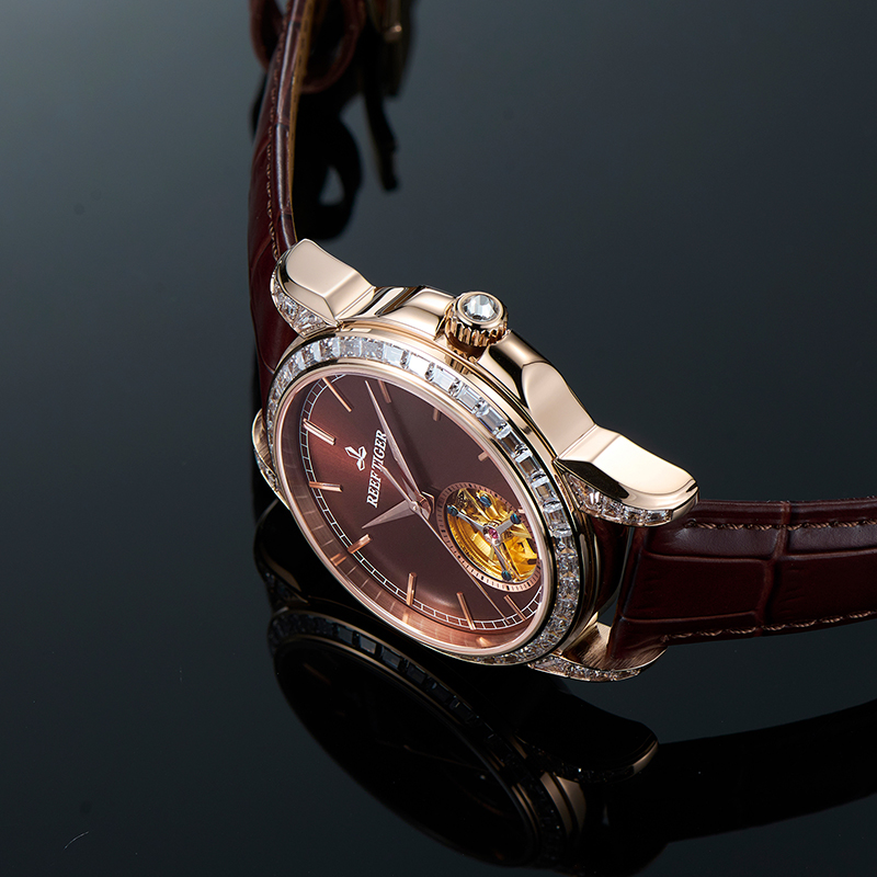 Reef Tiger RGA1904 gây ấn tượng mạnh mẽ ngay từ cái nhìn đầu tiên với thiết kế mặt số tròn cổ điển, kết hợp cùng các chi tiết đính đá tỉ mỉ. Sự kết hợp này tạo nên một vẻ đẹp sang trọng, lịch lãm, phù hợp với nhiều phong cách thời trang khác nhau. Các kim chỉ giờ và vạch số được thiết kế tinh tế, dễ đọc, đồng thời tăng thêm vẻ đẹp thẩm mỹ cho chiếc đồng hồ. Vỏ đồng hồ được làm từ thép không gỉ 316L cao cấp, đảm bảo độ bền và khả năng chống ăn mòn, giữ cho chiếc đồng hồ luôn sáng bóng theo thời gian.