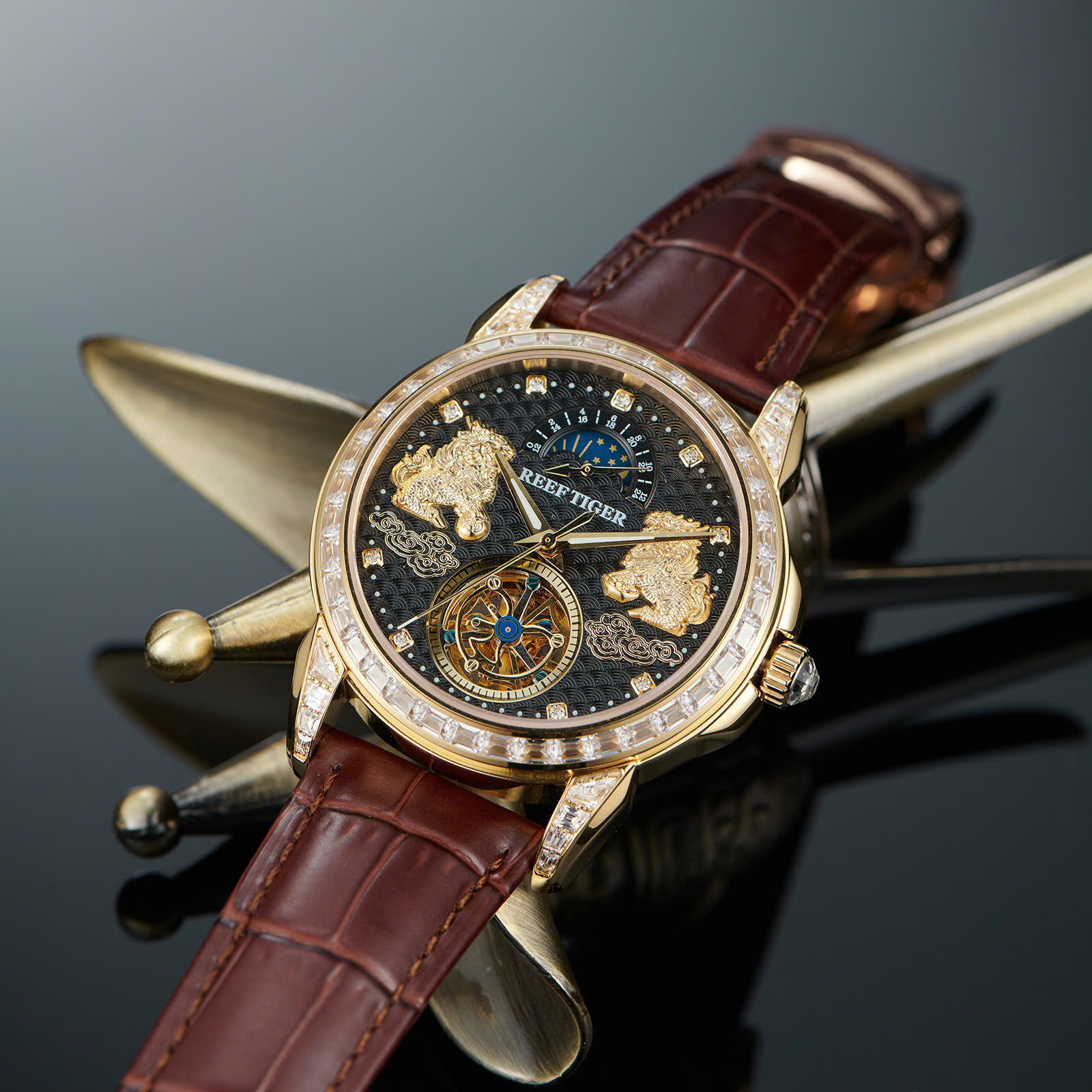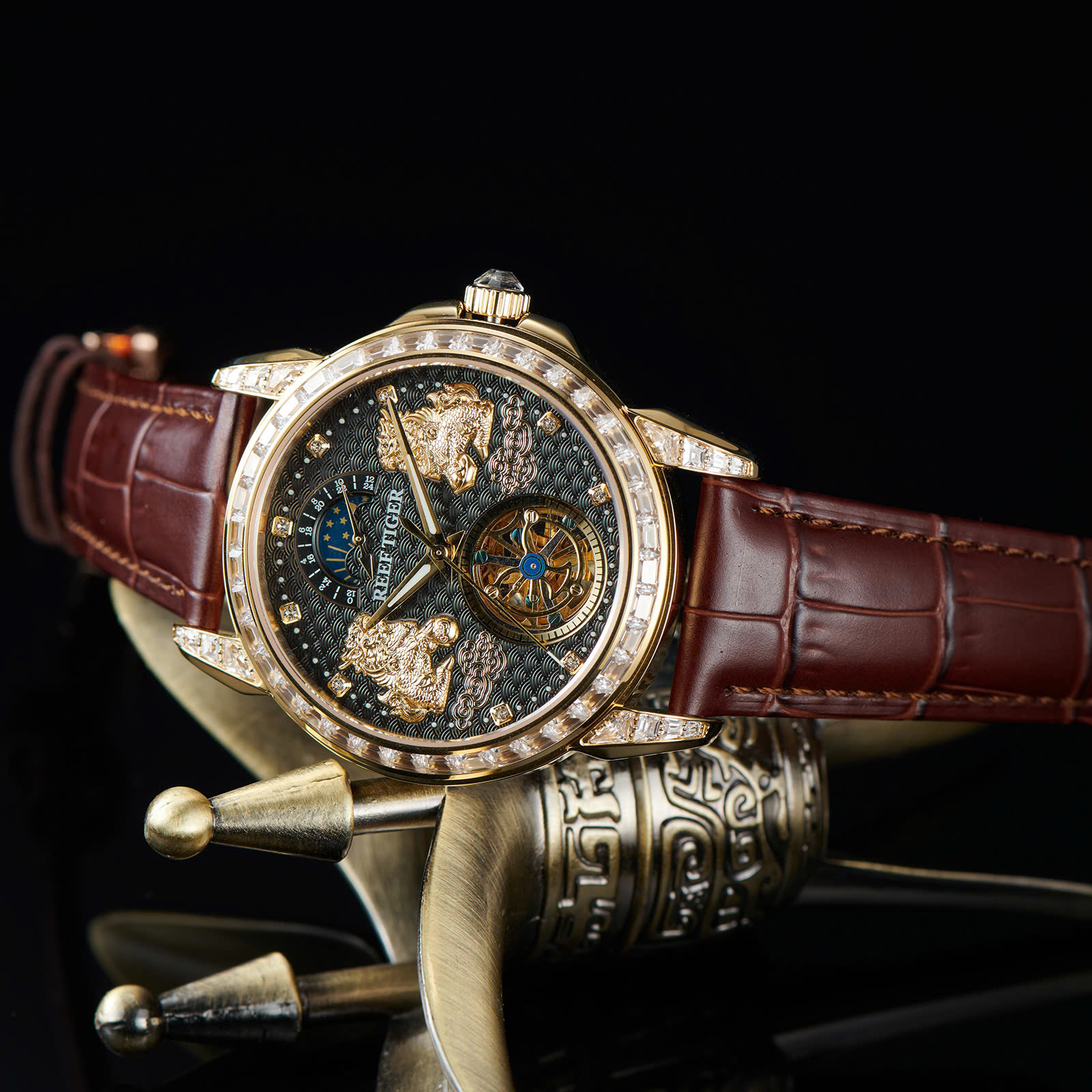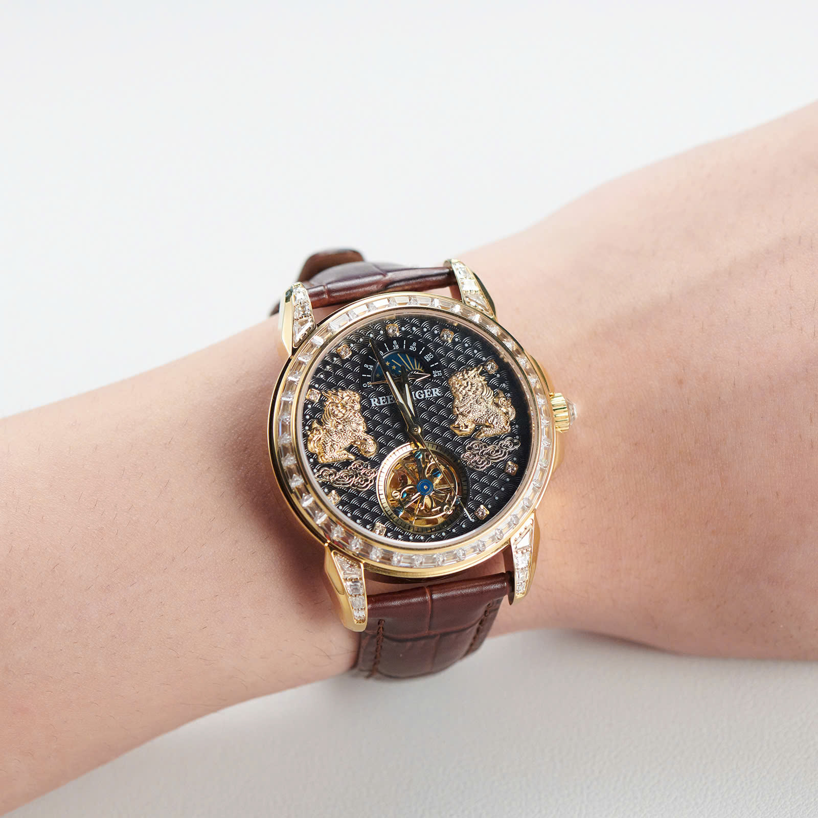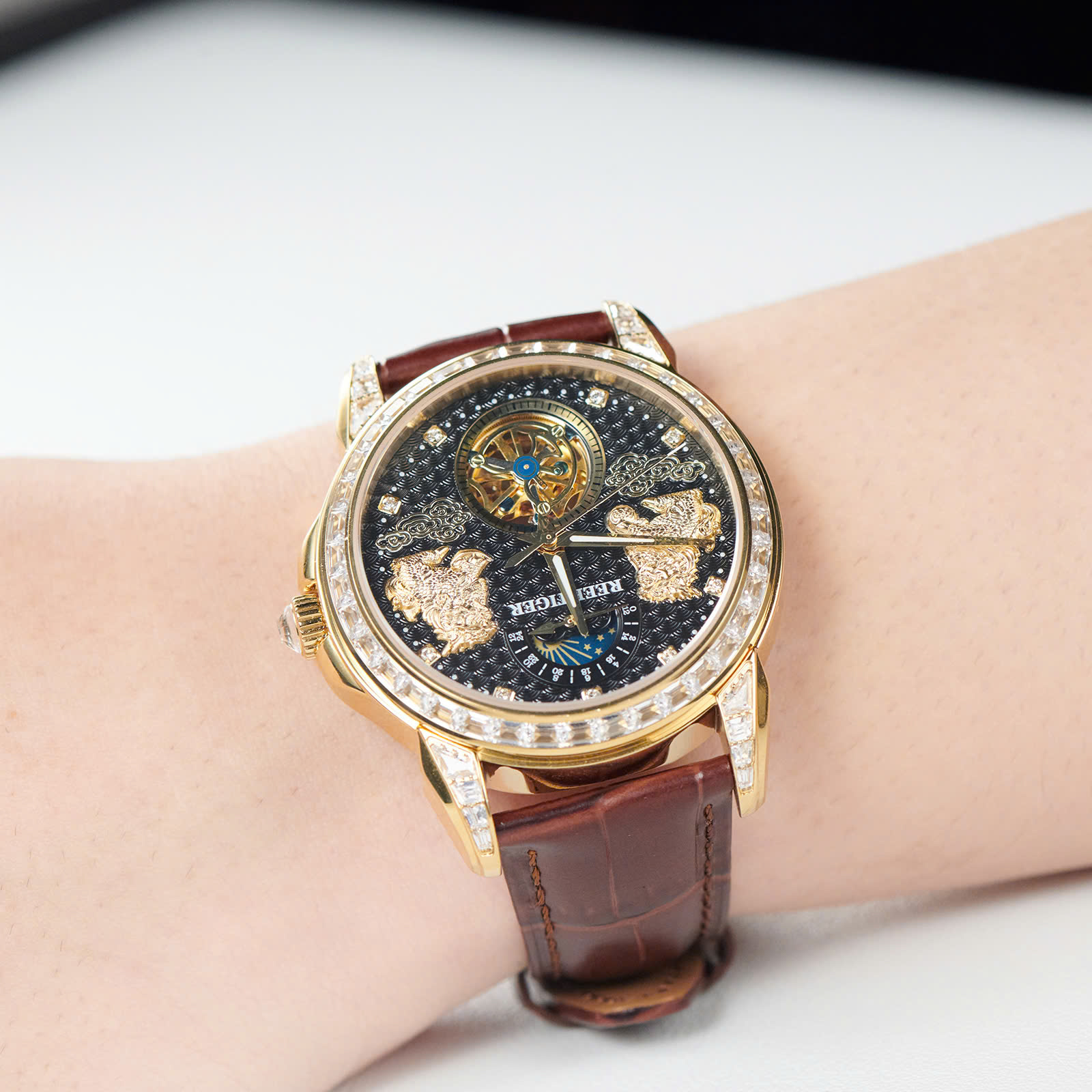 Đồng hồ nam **Reef Tiger RGA1935-PBSD** là sự kết hợp hoàn hảo giữa phong cách cổ điển và hiện đại, mang đến vẻ đẹp sang trọng và lịch lãm cho phái mạnh. Điểm nhấn đặc biệt của mẫu đồng hồ này chính là sự hiện diện của **hai con tỳ hưu** trên mặt số, biểu tượng phong thủy mạnh mẽ, đại diện cho sự thịnh vượng và bảo vệ tài lộc. Với thiết kế tỉ mỉ và tinh xảo, mặt đồng hồ không chỉ là một phụ kiện thời trang mà còn mang ý nghĩa may mắn, phù trợ cho người đeo. Kết hợp cùng chất liệu cao cấp và bộ máy chính xác, Reef Tiger RGA1935-PBSD xứng đáng là sự lựa chọn hoàn hảo cho những quý ông yêu thích sự đẳng cấp và phong thủy.
