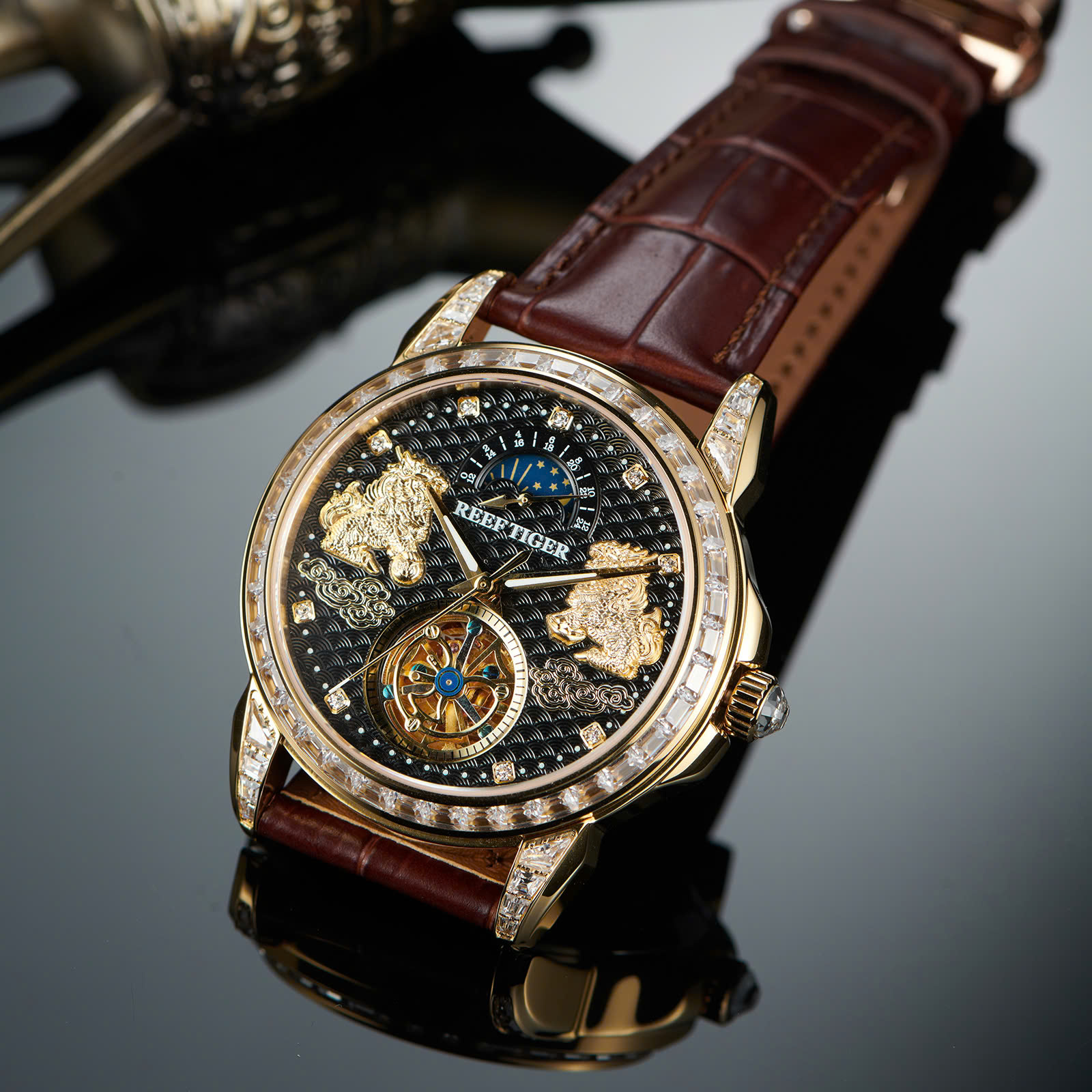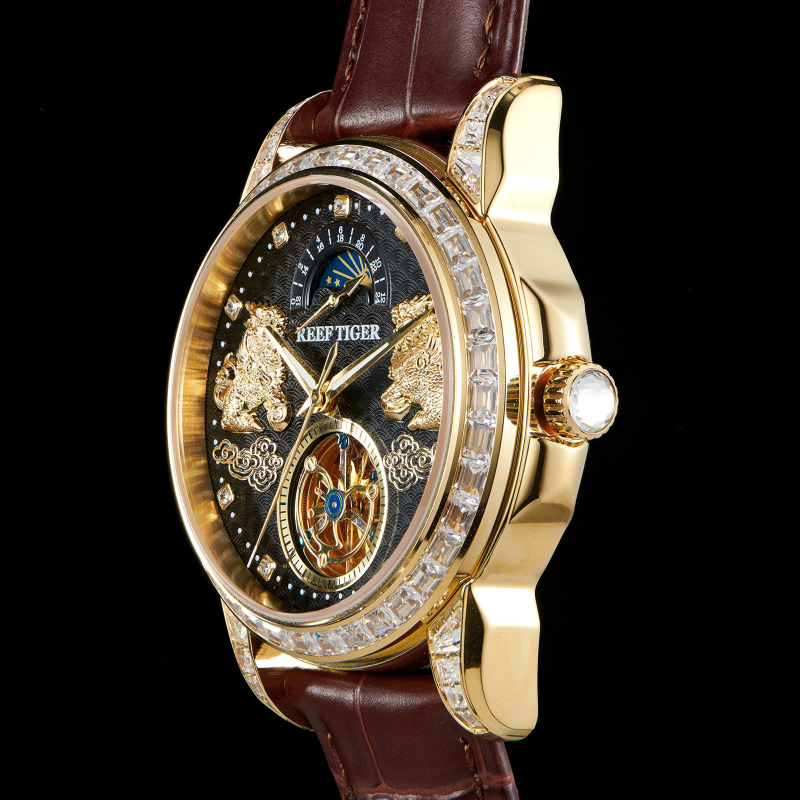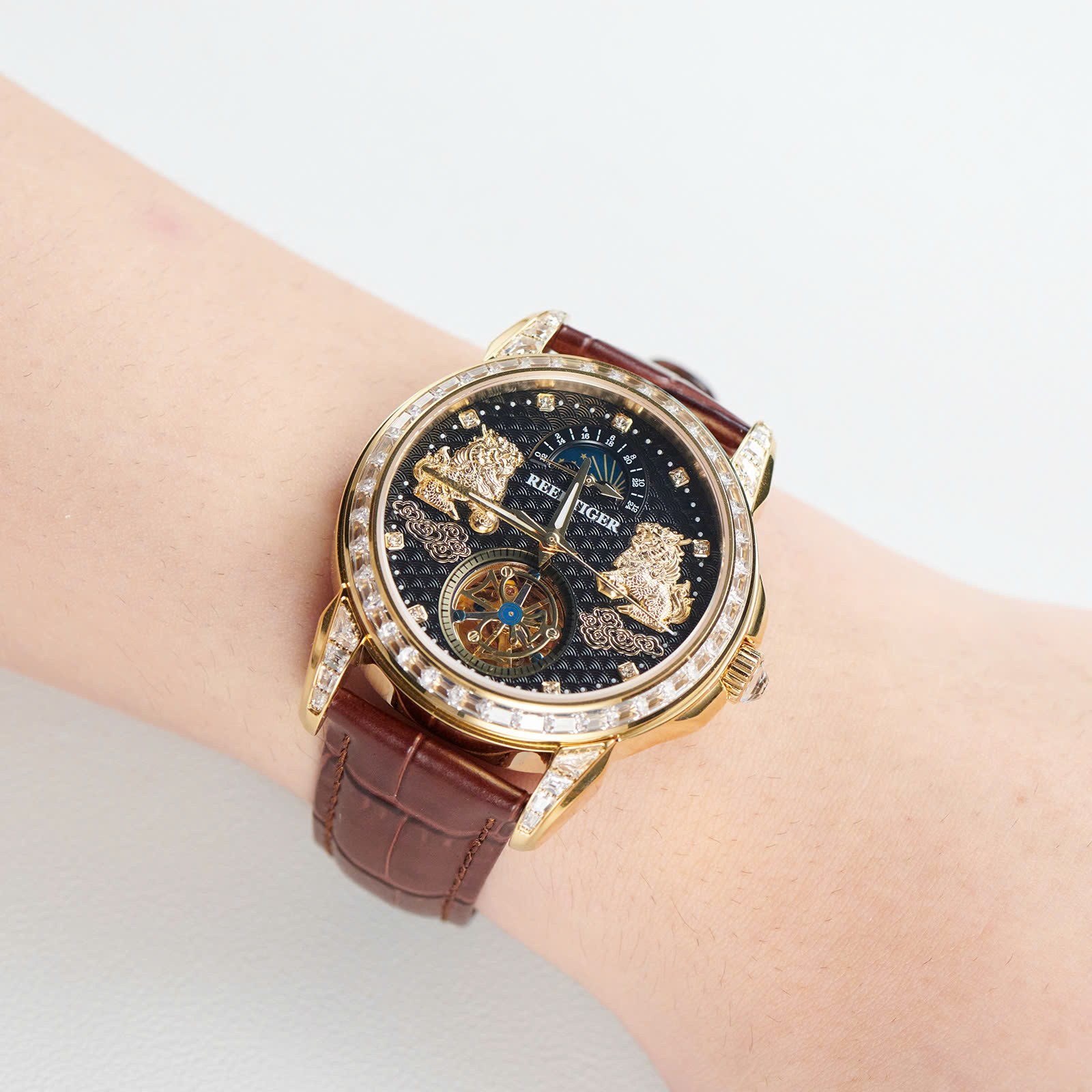 Đồng hồ nam **Reef Tiger RGA1935-PBSD** là sự kết hợp hoàn hảo giữa phong cách cổ điển và hiện đại, mang đến vẻ đẹp sang trọng và lịch lãm cho phái mạnh. Điểm nhấn đặc biệt của mẫu đồng hồ này chính là sự hiện diện của **hai con tỳ hưu** trên mặt số, biểu tượng phong thủy mạnh mẽ, đại diện cho sự thịnh vượng và bảo vệ tài lộc. Với thiết kế tỉ mỉ và tinh xảo, mặt đồng hồ không chỉ là một phụ kiện thời trang mà còn mang ý nghĩa may mắn, phù trợ cho người đeo. Kết hợp cùng chất liệu cao cấp và bộ máy chính xác, Reef Tiger RGA1935-PBSD xứng đáng là sự lựa chọn hoàn hảo cho những quý ông yêu thích sự đẳng cấp và phong thủy.