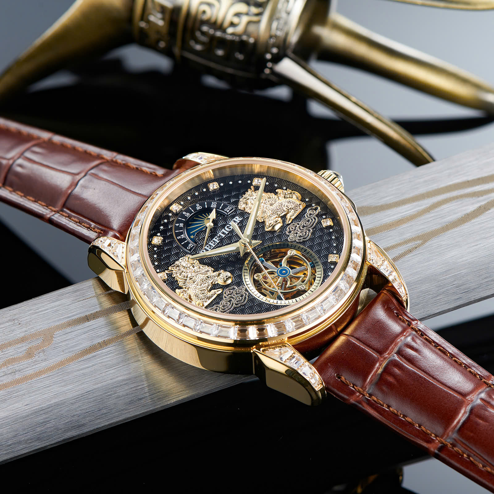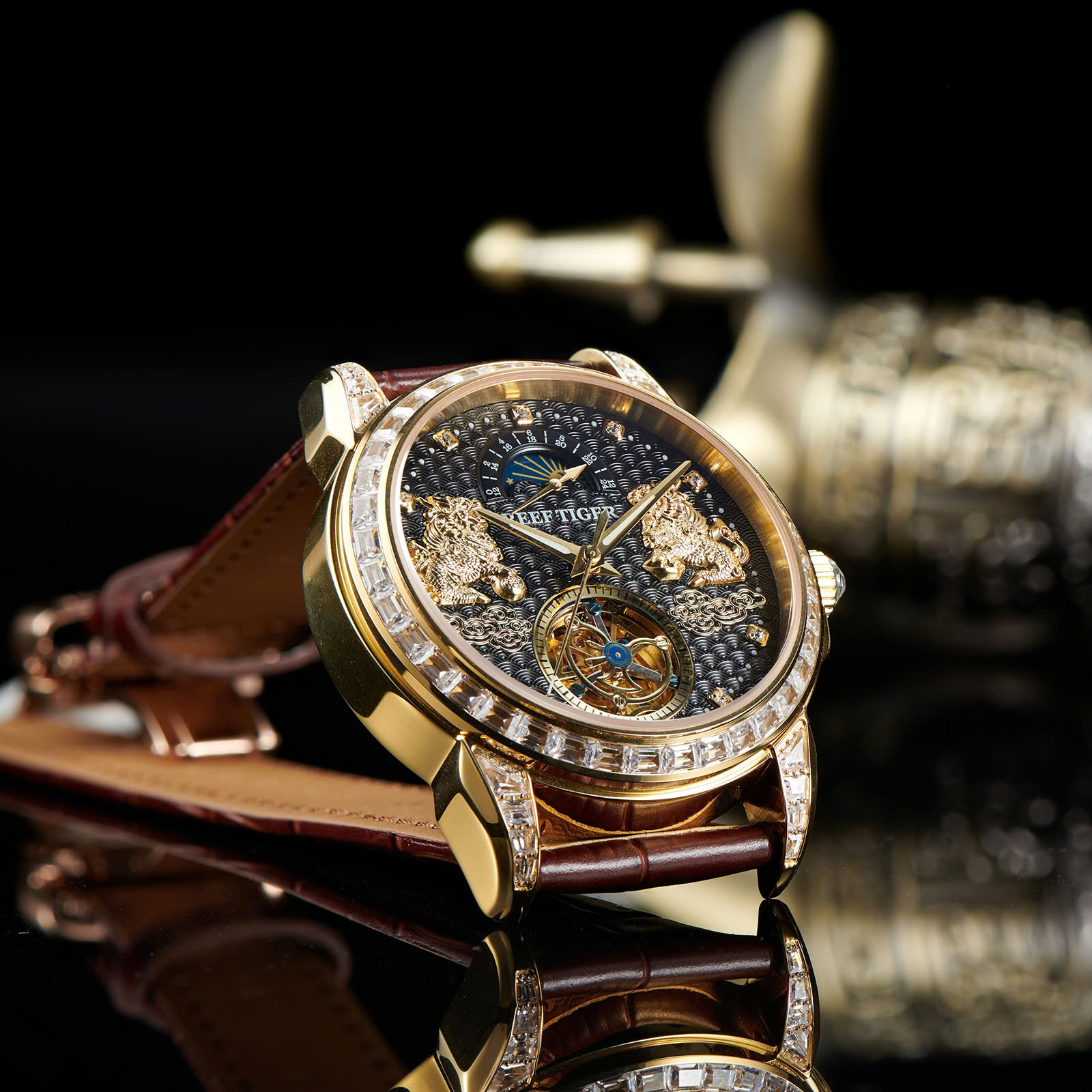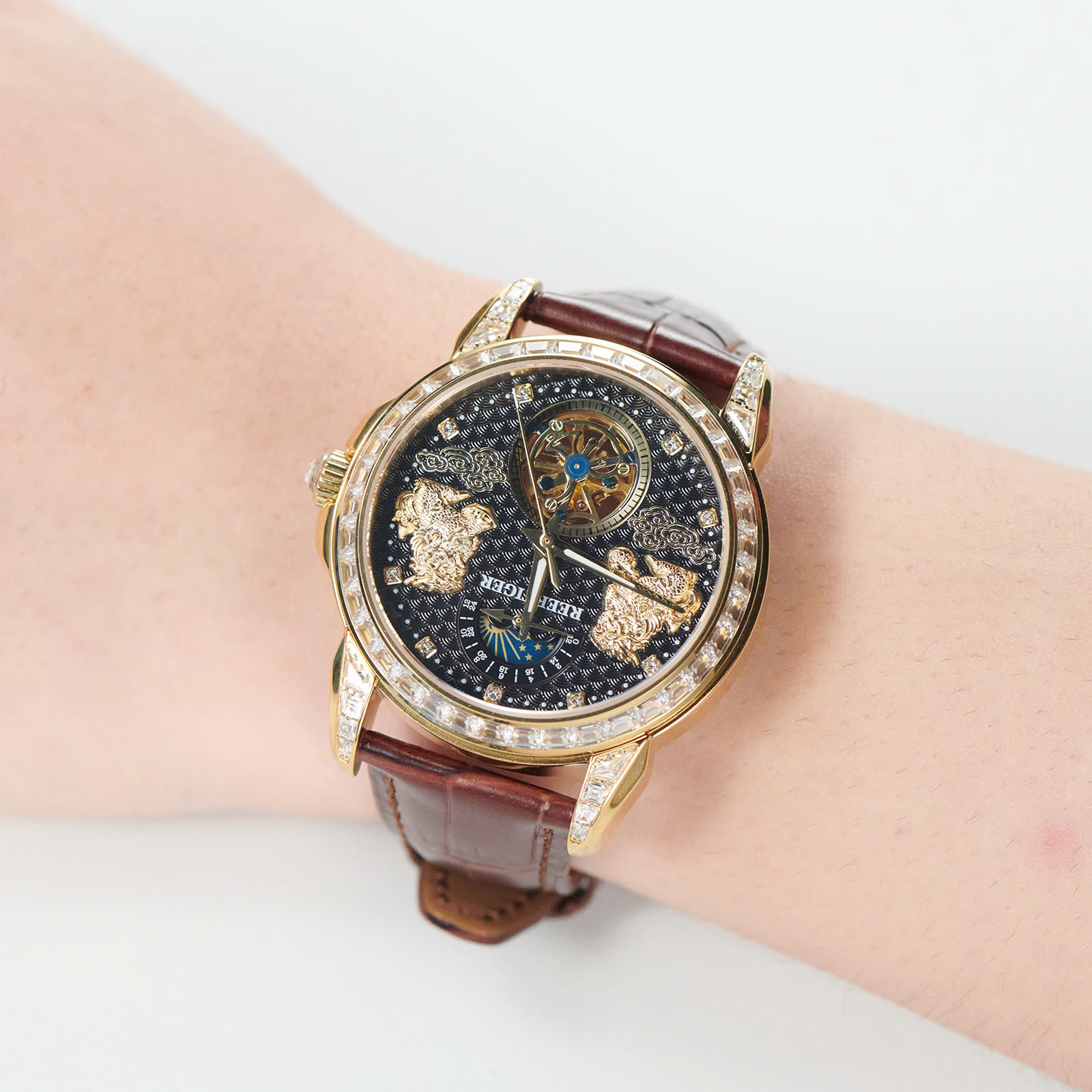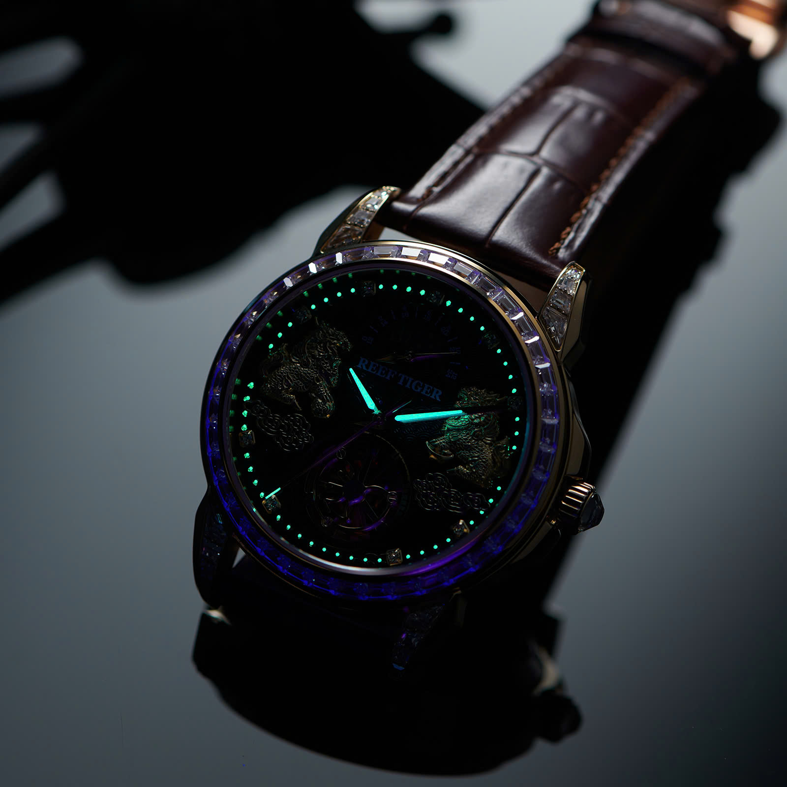 Đồng hồ nam **Reef Tiger RGA1935-PBSD** là sự kết hợp hoàn hảo giữa phong cách cổ điển và hiện đại, mang đến vẻ đẹp sang trọng và lịch lãm cho phái mạnh. Điểm nhấn đặc biệt của mẫu đồng hồ này chính là sự hiện diện của **hai con tỳ hưu** trên mặt số, biểu tượng phong thủy mạnh mẽ, đại diện cho sự thịnh vượng và bảo vệ tài lộc. Với thiết kế tỉ mỉ và tinh xảo, mặt đồng hồ không chỉ là một phụ kiện thời trang mà còn mang ý nghĩa may mắn, phù trợ cho người đeo. Kết hợp cùng chất liệu cao cấp và bộ máy chính xác, Reef Tiger RGA1935-PBSD xứng đáng là sự lựa chọn hoàn hảo cho những quý ông yêu thích sự đẳng cấp và phong thủy.