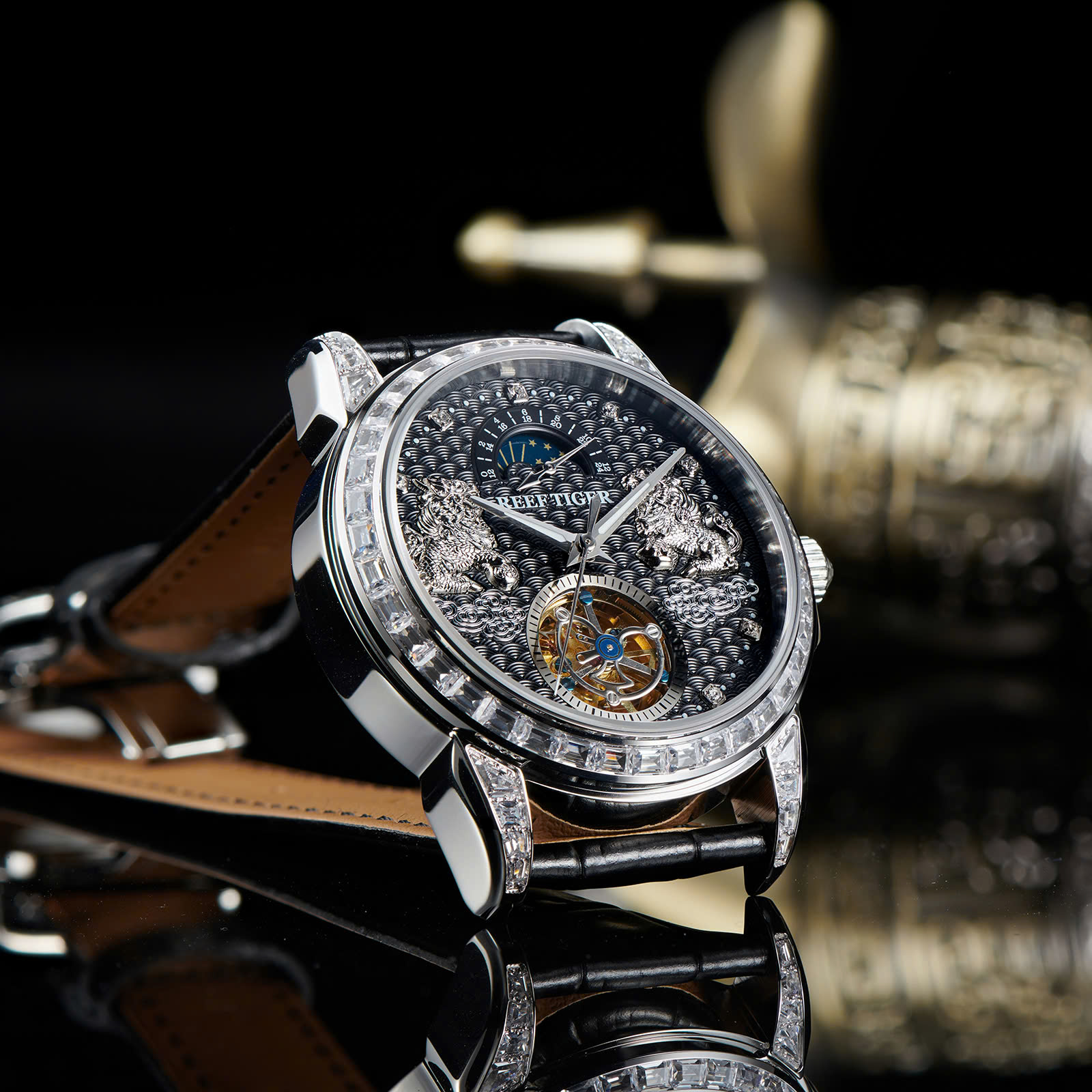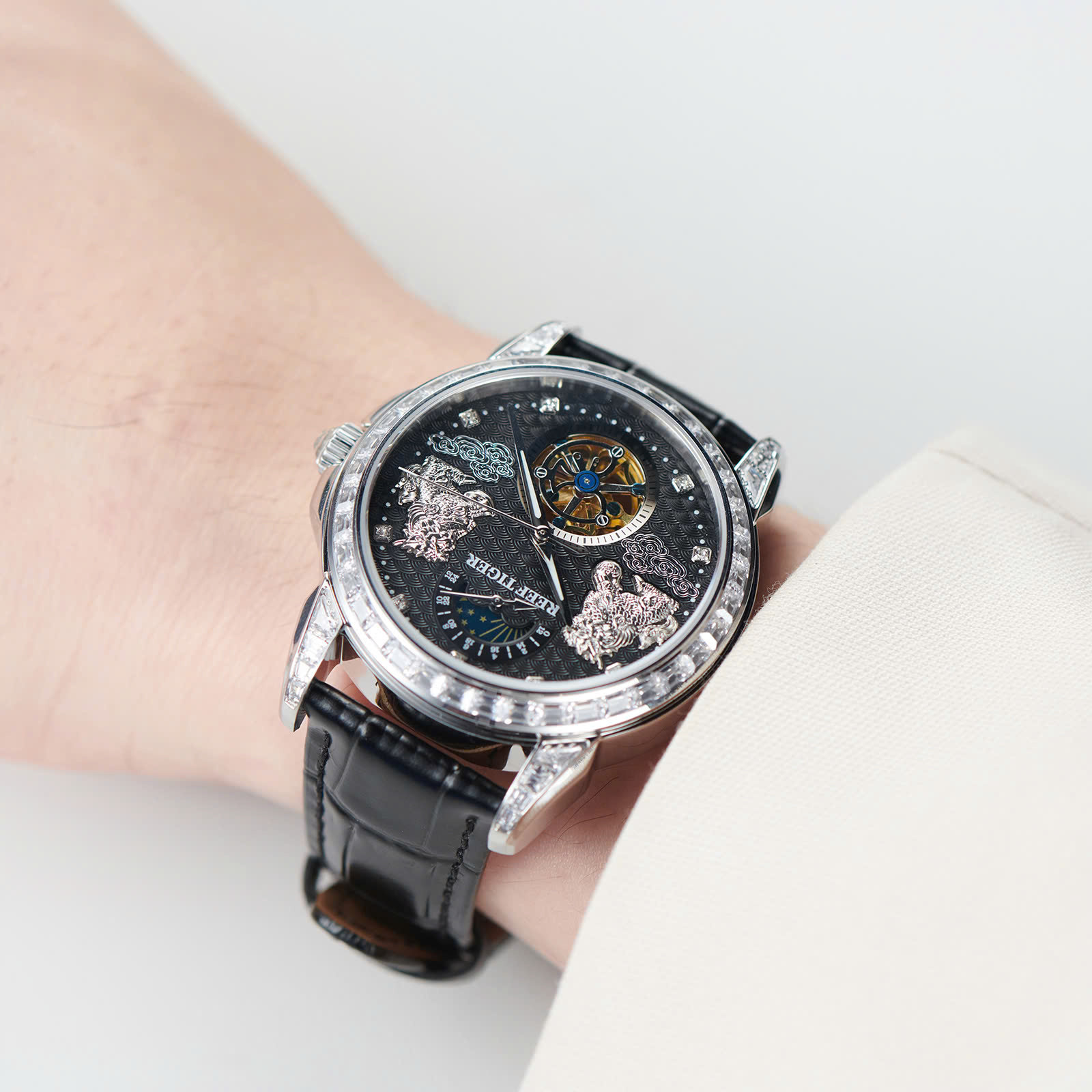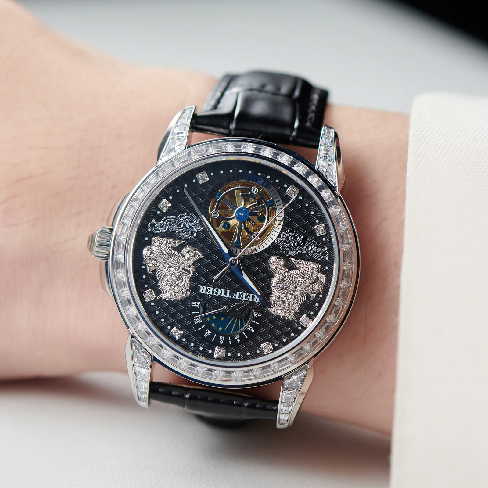 ĐỒNG HỒ NAM REEF TIGER RGA1935-YBBD là sự kết hợp hoàn hảo giữa phong cách sang trọng và đẳng cấp, dành cho những quý ông yêu thích sự tinh tế và quyền lực. Với thiết kế mặt đồng hồ độc đáo, nổi bật là hình ảnh hai con tỳ hưu mạnh mẽ, biểu tượng cho sự may mắn, thịnh vượng và tài lộc. Tỳ hưu không chỉ mang ý nghĩa phong thủy, mà còn tạo điểm nhấn nghệ thuật cho chiếc đồng hồ, làm tăng thêm vẻ uy quyền và khác biệt cho người đeo.
