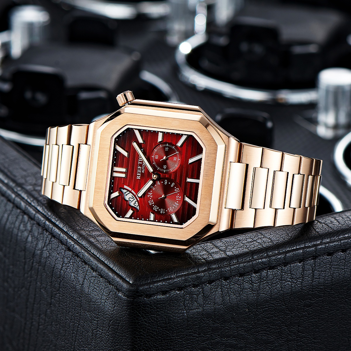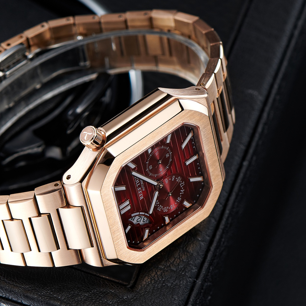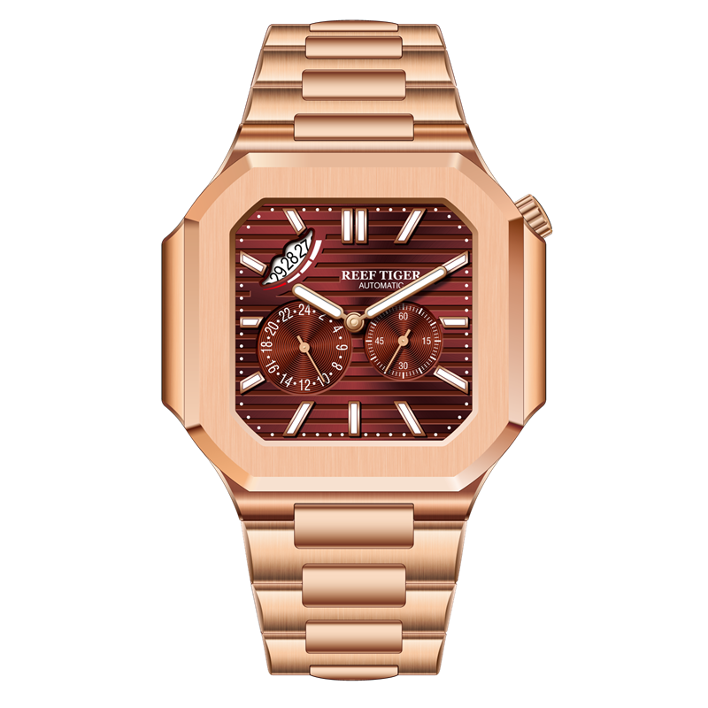 Điểm nhấn đầu tiên của Reef Tiger RGA20S9-PRPS chính là thiết kế mặt vuông độc đáo, khác biệt hoàn toàn so với những mẫu đồng hồ tròn truyền thống. Mặt vuông mang đến vẻ mạnh mẽ, nam tính và đầy cá tính cho người đeo. Các góc cạnh được bo tròn mềm mại, tạo sự hài hòa và tinh tế cho tổng thể thiết kế. Màu đỏ của mặt đồng hồ kết hợp với viền vàng càng làm tăng thêm vẻ sang trọng và thu hút.