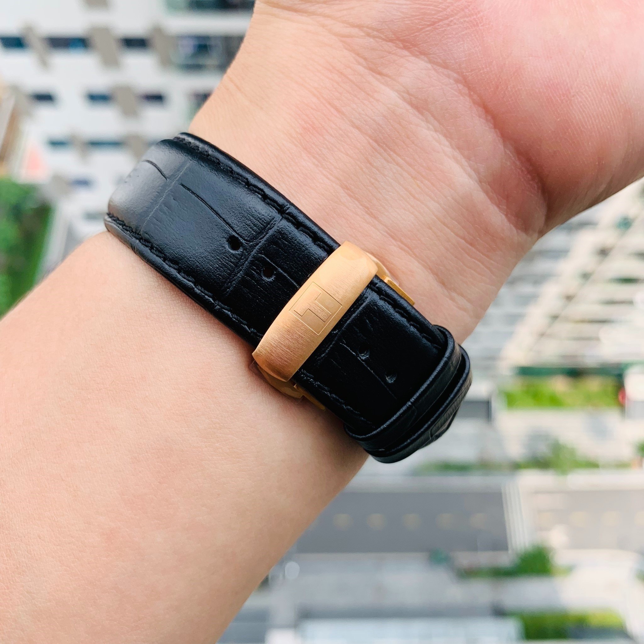 - Dây da đen dập vân cá sấu đi kèm với khóa bướm tiện lợi